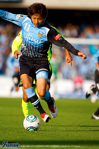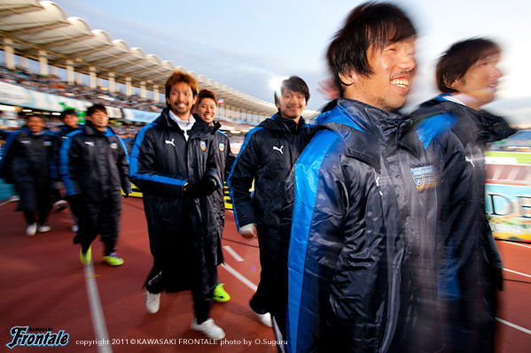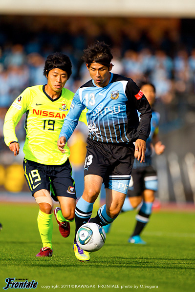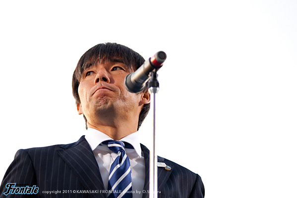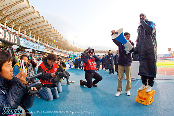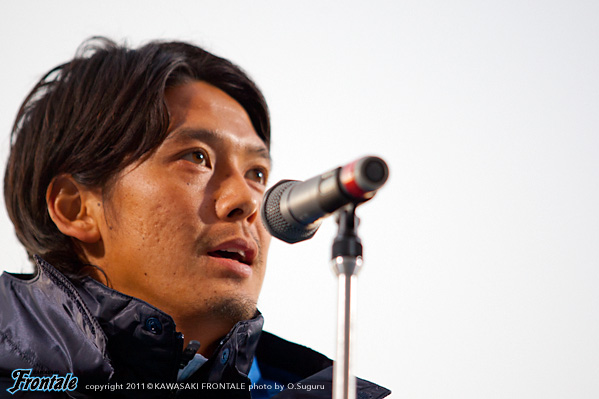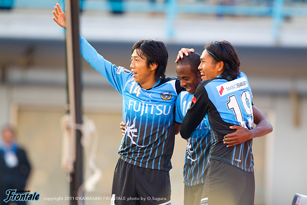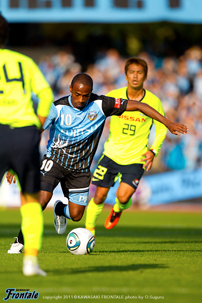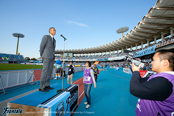 - 1点目は、すごくきれいなプレーだったと思う。自分が1人でエリアの中にいて、落ち着いて打つことができた。ユウのボールがすごくよかった。彼とは一緒にプレーしてきて、新しい選手で成長過程。本当に学びたいという気持ちと人の意見をすごくよく聞いて吸収しようとしている。だから、いい結果につながってよかった。彼がフロンターレのためにもっともっとゴールをしてくれる選手だと思っている。今シーズンはあまりゴールを決められず、自分にとって難しい状況だったが、フロンターレのユニフォームを着て等々力でプレーする最後の試合で神様が答えを準備してくれていた。今日は泣かないと頭のなかで繰り返していたが、感情が大きくなりすぎて抑えきれなかった。最初はゴールを決めたらダンスをしようと思っていた。3年前ぐらいから息子たちにダンスを踊ってくれとお願いされていた。でも自分はダンスがあまりうまくない。息子たちと一緒に練習していたが、なかなか勇気が出なかった。でも等々力最後のゲームで踊らないと息子たちに何を言われるかわからない。だからダンスを踊ってからGゾーンに走っていった。2ゴール目もダンスを踊った。息子が2人いるので、1人ずつのために踊らないとケンカになってしまうので。日本にきて9年間、準優勝までいくことはできたが、タイトルは獲れなかった。ただタイトルを獲っただけでは、忘れ去られることもある。ここでの皆さんのやさしさ、支えてきてくれたものが基盤となって、自分の心のなかに残る。この先、自分がどうなるかはわからない。ずっと選手を続けるかもしれないし、将来監督になるかもしれない。そのときにはまた戻ってきたい。今年はチームとして厳しい時期が続いたが、日本全体でも東日本大震災という悲しい出来事があった。中断期間は10日間ぐらいブラジルにいたが、家族からはこの時期に日本に戻るべきではないと言われていた。でも日本人全員が日本で頑張っているし、フロンターレには9年間一緒にやってきた仲間がいて、たくさんのサポーターがいる。彼らを裏切ることはできない。クラブとの契約を果たすのはもちろんだが、サポーターとの約束も守らなければならない。シーズン途中に他のクラブからの話もあり、正直気持ちも揺らいだが、日本でプレーしていて、家族も日本にいることを考えると、最後まで約束を果たすのが正しいことだと信じていた。今日のように皆さんに盛大にセレモニーをやってくれるとは思っていなかった。すごく幸せな瞬間になった。みんなのやさしさ、自分のことを想ってくれているんだと嬉しく感じた。でもフェスタはまだ終わったわけじゃない。最終節もあるし、12月6日にも最後のフェスタがある。この9年間でフロンターレのレベル、チーム力はずいぶんと上がった。今となってはフロンターレと対戦するチームはリスペクトの気持ちを持って試合に臨んでくる。J1に昇格して成長してきたし、リーグ戦準優勝3回、ナビスコカップ準優勝2回というのは、クラブの成長の結果だと思う。ただ、これは自分だけの力ではなく、今までずっとフロンターレでやってきたいろんな選手たちの力が、今こういった歴史を作っていることを忘れてはいけない。もちろん、これからもっと素晴らしい歴史をこのフロンターレは作り上げていくと信じている。