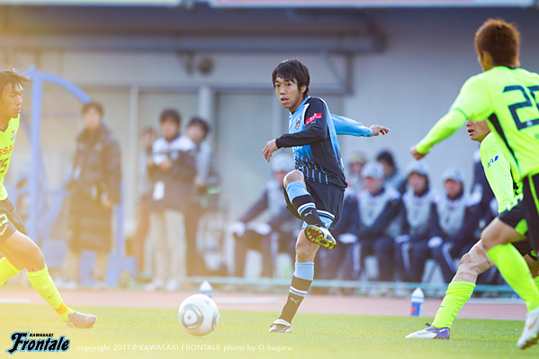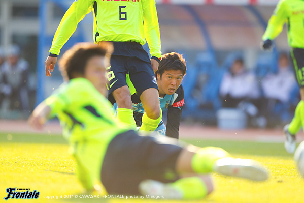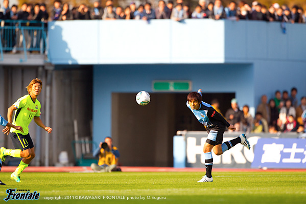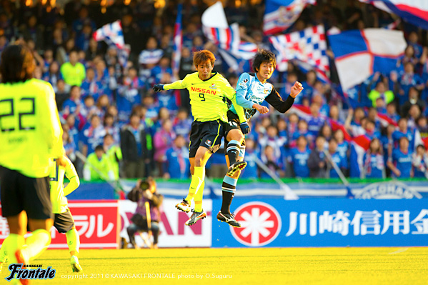 48分、フロンターレの攻撃。左サイドから抜け出した小宮山がクロスを入れ、小林がゴール前に飛び込むがDFにクリアされる。迎えた49分、中盤から田坂がドリブル突破。バイタルエリアに持ち込み左足でシュート性のボールを入れ、このボールに反応した横浜FMのDFの足に当たりオウンゴールとなる。(1-0) 50分、横浜FMの攻撃。谷口にボールを持たれバイタルエリアに入り込まれるが、守備陣で挟み込み対応。51分、フロンターレの攻撃。山瀬のスルーパスに抜け出したジュニーニョが左サイドから折り返し。飛び込んだ小林がDFに倒されるが、これはノーファールの判定。52分、カウンターから右サイドの田坂がアーリークロスを入れるが、ゴール前でDFにクリアされる。53分、中盤から田坂が裏のスペースへボールを入れ、抜け出した山瀬がGKのタイミングを外してボールを流し込むが、このシュートは惜しくもゴール右に外れる。55分、山瀬が左サイドをドリブル突破。クロスを狙うがDFに止められる。57分、右サイドでボールを受けたジュニーニョが折り返し。セカンドボールを拾って中村からパスを受けた小林がゴールに迫るが、ぎりぎりのところでDFにブロックされる。62分、横浜FMの攻撃。右サイドからボールをつながれ兵藤にクロスを入れられるが、ゴール前で伊藤がクリア。63分、フロンターレの攻撃。GK杉山のロングキックを小林がヘッドで落とし、ジュニーニョが胸トラップからミドルシュートを放つが、このボールは大きく外れる。64分、中盤でボールを奪い右サイドのジュニーニョがクロスを入れるがDFにクリアされる。67分、横浜FMの攻撃。左サイドから連続して金井にクロスを上げられ、一度目は伊藤がクリア。二度目は誰も触れずゴールにボールが向かうが、これはポストに当たって外れる。さらに横浜にゴール前に圧力をかけられるが、ここはディフェンス陣がしのぐ。
