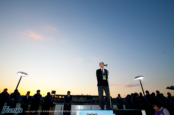 今日、ホーム最終戦ということで、セレモニーもあり、サポーターの皆さんへの感謝を述べさせてもらったんですが、本当にいつも変わらず、支えてくれた。本当に1年間ありがとうございましたという言葉を最初にあげなければならないと思っています。そういった中で、ジュニーニョの等々力でのラストゲームになるという事でどうしても勝ちたい。そして等々力で勝ってなかったという事も含めて選手たちの勝ちたいという気持ちが少し硬い方向に前半は出てしまって、というゲーム展開だったのかなと思っています。前半、どちらかというと、マリノスさんに押されてしまい、なかなかマイボールの時間が非常に短いという展開が続きました。途中から徐々に落ち着き始めてボールを動かす時間が増えたんですが、よく前半を0で抑え、折り返せたなというところだったと思います。それでハーフタイムに選手たち自身も落ち着いて後半に入れた。多少うちと比べると前半に飛ばして、ルーズボールの反応等を含めて早かったマリノスさんの足も止まり始めたということもあり、後半はこちらの流れになったのかなと思います。そういう中で、最初のゴール、ラッキーな部分はありましたが、あのゴールが非常に大きかったと思いますし、その中でカウンターが生きる形になり、そこで星を持っていると言っていいと思います。ジュニーニョが2つゴールを決めてという展開になりました。本当、いつも集まってくださるサポーターには、なかなか勝利、そして笑顔をプレゼントできませんでしたが、ようやく今日、すごくいい形で届けることができましたので。まだリーグが終わっていませんし、次のゲームで最大で2つ順位を上げる可能性があると。今の段階ですが。持っています。そこを含めて、そして天皇杯もありますので、最後まで今ひとついい流れができはじめているので崩さないようにやっていきたいと思います。以上です。