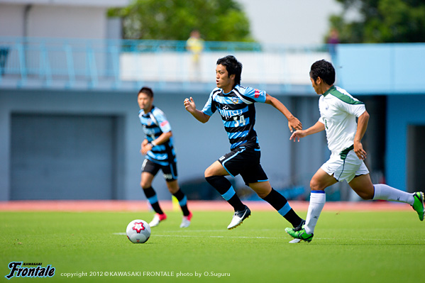 27分、自陣からボールをつないで風間矢からボールを受けた小林がダイレクトで合わせるが、DFにブロックされる。28分、さらに攻勢をかけて登里の突破から折り返しを田中裕が合わせるが、シュートは惜しくもゴール右に外れる。31分、ペナルティエリア左角からのフリーキック。風間希のシュートはゴール上に外れる。33分、ボールをつないで山越が左サイドから折り返しを入れるがクリアされる。34分、徳山大学の攻撃。利根のドリブル突破はジェシが対応。36分、フロンターレの攻撃。パスをつないで登里が左サイド裏のスペースに抜け出すが、クロスは大きく外れる。38分、ボールを細かくつないで山瀬がシュート。ブロックされたボールを風間矢が狙うが、シュートは惜しくもゴール左に外れる。40分、徳山大学の攻撃。カウンターから利根にシュートに持ち込まれるが、田中裕がスライディングでブロック。41分、フロンターレの攻撃。山瀬が右サイドでボールキープ。パスをつないで大島のスルーパスに反応した小林が右サイドから折り返しを狙うが、DFにブロックされる。42分、風間希の右コーナーキックに田中裕が飛び込むが、こぼれ球はクリアされる。43分、縦パスを受けた風間矢がつぶれ、こぼれたボールに田中裕が飛び込み右サイドからシュートを放つがブロックされる。43分、風間希の右コーナーキックに田中裕がヘッドで合わせるが枠には飛ばず。アディショナルタイム、ボールをつないで小林からラストパスを受けた山越が左サイドからシュートを放つが、ボールは惜しくもゴール右に外れる。やや不安定な立ち上がりからフロンターレがじょじょにリズムをつかむが、なかなか決定的なチャンスに持ち込めず。0-0で前半を折り返した。