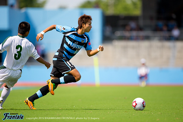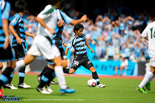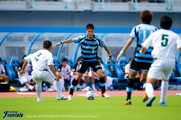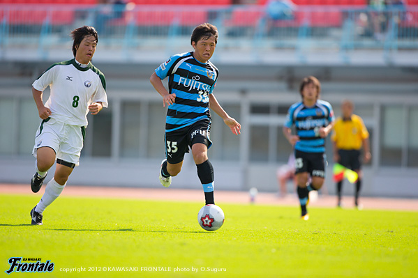 後半スタートから小林に代えて小松が入り最前線へ。山瀬が右ワイドのポジションへ。46分、フロンターレの攻撃。左サイド裏のスペースに抜け出した登里が速い折り返し。走り込んだ山瀬が合わせるが、シュートはDFにブロックされる。47分、セカンドボールをつないでゴール前の小松にボールが渡るが、これはハンドの判定。迎えた49分、風間希のドリブル突破で中央から崩しをかけ、こぼれ球に反応した山瀬が追いつきシュートを決めてフロンターレが先制点を挙げる。(1-0) 50分、フロンターレの攻撃。ボールをつないで山越が左サイドから折り返し。トラップした山瀬が左足でシュートを放つが、惜しくもGKに止められる。51分、コーナーキックから田中裕がボールを収め、右サイドからシュート性のボールを入れるがDFにブロックされる。52分、井川からボールを受けた山越が左サイドからクロス。ファーサイドで小松がヘッドで合わせるが枠には飛ばず。53分、徳山大学の攻撃。中盤でボールを奪われ林幹にシュートに持ち込まれるが、ここはGK杉山がキャッチ。55分、再び中盤でボールを奪われ、カウンターから利根にミドルシュートを打たれるがGK杉山がキャッチ。56分、フロンターレの攻撃。ボールをつないで押し込むがラストパスには至らず。57分、山瀬の早いリスタートから登里が左サイドから強烈なシュートを放つが、惜しくもGKに止められる。58分、風間希の左コーナーキックを小松がヘッドで合わせるが、惜しくもゴール前でクリアされる。61分、左サイドの登里と山越のコンビネーションから崩しをかけて圧力をかけるが、フィニッシュにつながらず。63分、徳山大学の攻撃。パスをつながれ右サイドの金子にアーリークロスを入れられるが、このボールはゴール前を通過。64分、中盤でボールを奪われ大坪に左サイドからスルーパスを出されるが、飛び出した利根が触ったボールをGK杉山が体に当ててピンチをしのぐ。