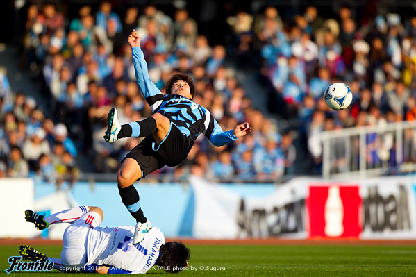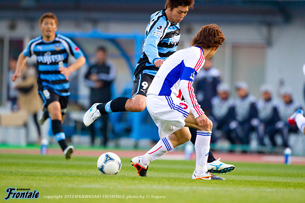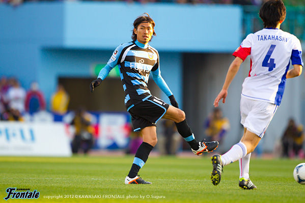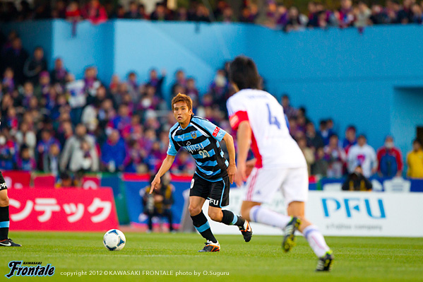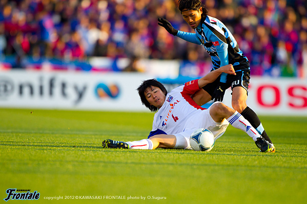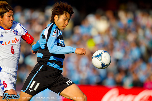 23分、FC東京の攻撃。谷澤のミドルシュートは森下がブロック。GK西部がキャッチ。25分、フロンターレの攻撃。レナトの裏へのボールを小林が収めてパスをつなぐがフィニッシュに持ち込めず。26分、FC東京の攻撃。パスを回されルーカスにスルーパスを狙われるが、飛び出した石川はオフサイド。27分、徳永の右サイドからのドリブル突破は小宮山が対応。27分、右コーナーキックの場面。石川のボールをクリアしきれず、こぼれ球に走り込んだ谷澤にシュートを打たれるが、これはゴール右に外れる。30分、羽生の裏のスペースへのボールに抜け出した石川にループシュートを打たれるが、GK西部が下がりながらキャッチ。30分、フロンターレの攻撃。直後に反撃。田坂の裏へのボールに抜け出した小林がシュートを放つが、惜しくもGKにセーブされる。33分、ボールをつないで實藤が右サイドから折り返しを送るが、クリアされる。さらに森下のロングボールから矢島が粘ってシュートに持ち込むが枠には飛ばず。35分、FC東京の攻撃。スローインから谷澤に裏に抜け出されるが、實藤とジェシで対応。36分、ボールをつながれ中央突破を狙わるが森下がクリア。38分、フロンターレの攻撃。FC東京のセットプレーをしのいでカウンターへ。小林のドリブルからゴール前に圧力をかけて小林が連続してシュートを放つが、いずれもブロックされる。39分、ボールを奪い返して攻勢をかけ、矢島がつぶれて背後の中村がループシュートを狙うが大きく外れる。41分、ロングボールを矢島が収めて小林からボールを受けたレナトがミドルシュートを狙うが、これはDFにブロックされる。44分、中村の裏へのボールに競り勝ったレナトにボールが渡るがフィニッシュには持ち込めず。序盤はFC東京にボールを回される時間帯が続くが、要所を締めたチームディフェンスで対応。じょじょにフロンターレがペースをつかむが、チャンスをゴールにつなげられず。0-0で前半を折り返した。
