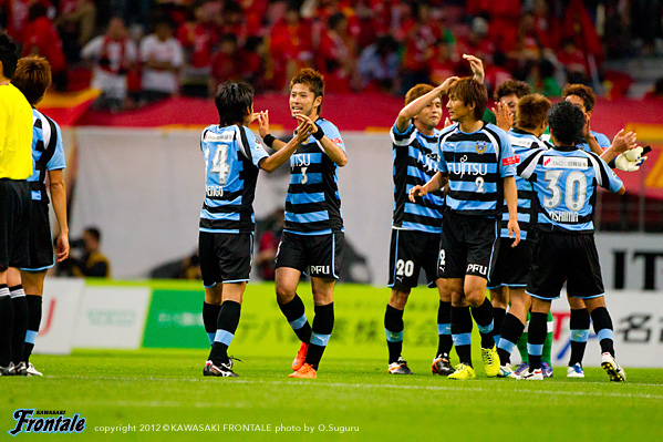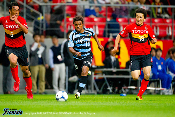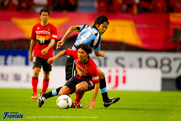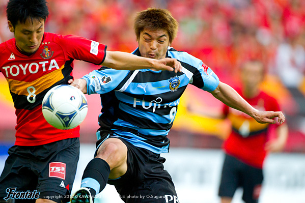 フロンターレのスターティングメンバーは、最前線に矢島、右ワイドに田坂、左に楠神、中盤前目に中村と大島が並び、底に稲本、登里-森下-井川-田中裕の最終ライン、GK西部。立ち上がり1分、フロンターレの攻撃。キックオフからボールをつないで右サイドの田中裕が速いクロスを入れ、ゴール前に矢島が飛び込むが惜しくもタイミングが合わず。しかし2分、左サイドに流れ大島がアーリークロスを入れ、ゴール前で矢島がDFを引きつけながら潰れ、こぼれたボールに走り込んだ田坂が左足でシュートを決めて先制点を奪う。(1-0) 5分、名古屋の攻撃。左サイドからのフリーキックの場面。三都主のボールを藤本に頭で合わせられるが、これはGK西部がキャッチ。7分、ダニルソンのミドルシュートはDFに当たってGK西部がキャッチ。8分、フロンターレの攻撃。早いリスタートから田中裕が右サイドをドリブル突破。折り返しを入れるがゴール前には合わず。迎えた9分、名古屋の攻撃。玉田へのクサビのボールのこぼれ球に反応したケネディに左足で強烈なミドルシュートを決められ同点に追いつかれる。(1-1) 10分、フロンターレの攻撃。左サイドでボールを受けた楠神のミドルシュートはブロックされ、大島のミドルシュートはゴール左に外れる。11分、中盤で相手をかわした中村がドリブルでボールを運び左サイドへ展開。矢島がドリブルから勝負をしかけて左足でシュートを放つがGKにキャッチされる。12分、登里が左サイドからドリブルをしかけてクロスを入れるがGKにキャッチされる。14分、名古屋の攻撃。ボールをつながれ三都主に左サイドからクロスを入れられるが、このボールはGK西部がキャッチ。迎えた14分、中盤右サイドから中村が浮かし球を入れ、走り込んだ矢島がヘッドで合わせて追加点を奪う。(2-1) 15分、名古屋の攻撃。左サイドから金崎にミドルシュートを打たれるが、ここはGK西部がキャッチ。17分、右コーナーキックの場面。藤本のボールを闘莉王に頭で折り返されるが、守備陣がゴール前ではね返す。19分、フロンターレの攻撃。リスタートの流れから中村がスルーパスを入れるが、このボールは前線にはタイミングが合わず。20分、中盤で中村がインターセプト。パスを受けた右サイドの田坂が折り返しを入れるが、惜しくも中村には合わず。21分、右コーナーキックの場面。ショートコーナーから中村がボールを入れてゴール前で混戦となるが、フィニッシュには至らず。