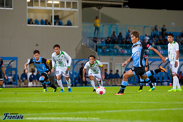 フロンターレのスターティングメンバーは、トップに矢島、左にレナト、右に小林。中盤前目に大久保と森谷、底に稲本。最終ラインは登里-伊藤-ジェシ-田中裕、GK杉山。立ち上がり2分、フロンターレの攻撃。レナトが中盤からドリブル突破をしかけるがファールで止められる。3分、大久保のキープから右サイド田中裕がクロス。こぼれ球にレナトが反応するが、右足のシュートは大きく外れる。迎えた4分、フロンターレの攻撃。中盤で小林がインターセプト。右サイドから速いボールを入れ、ニアサイドに走り込んだ矢島が合わせて先制点を挙げる。(1-0) 5分、東京Vの攻撃。カウンターをしかけられ巻にスルーパスを狙われるが、ジェシが落ち着いて対応。7分、フロンターレの攻撃。ジェシのロングフィードからボールをつなぎ、登里が左サイドから速いボールを入れるが、DFにクリアされる。8分、後ろに流れたボールにレナトが追いつき折り返し。矢島がシュートを放つが、惜しくもゴール左に外れる。迎えた8分、左コーナーキックの場面。レナトのボールからのゴール前混戦となり、東京VがファールをおかしPKを獲得。9分、このPKを大久保が落ち着いて決めて追加点を挙げる。(2-0) 12分、フロンターレの攻撃。右サイドから攻勢をかけるがラストパスにつながらず。13分、右コーナーキックの場面。森谷のボールをジェシが戻すがGKにキャッチされる。15分、中盤から大久保が裏のスペースにボールを入れるが前線には合わず。16分、中盤左サイドからレナトが絶妙の浮かし球を入れ、追いついた小林がフリーでシュートを放つが、ここは惜しくもGKにセーブされる。17分、相手陣内レナトがパスカット。左サイドからの素早い折り返しを受けた森谷が反転してシュートを放つが、惜しくもGKに止められる。18分、東京Vの攻撃。中島のドリブル突破から飯尾にボールを入れられるが守備陣が対応。19分、フロンターレの攻撃。レナトの左サイドからのアーリークロスを小林がヘッドで折り返し。森谷がループシュートを狙うがゴール上に外れる。21分、フロンターレの攻撃。ボールをつないで押し込み、最後は登里がミドルシュートを狙うがDFにブロックされる。