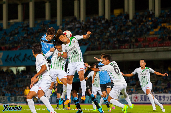 後半スタートからジェシに代えて實藤がピッチへ。46分、フロンターレの攻撃。稲本が背後のスペースを狙うがレナトには通らず。47分、東京Vの攻撃。パスをつないで右サイド森に突破を許し、折り返しを中島に合わせられるが、田中裕が戻ってぎりぎりのところでクリア。ピンチをしのぐ。48分、左サイドから崩しをかけられ小池のクロスを西にヘディングで合わせられ、こぼれ球を拾った森に右サイドから速いボールを入れられるがゴール前を通過。49分、右サイドに展開され中島に速いボールを入れられるが、巻には伊藤が対応。こぼれ球はGK杉山がキャッチ。危ない場面が続く。51分、フロンターレの攻撃。右サイドでパスをつないで大久保が左足でミドルシュートを放つがDFにブロックされる。52分、東京Vの攻撃。鈴木の中盤からのロングボールはGK杉山がキャッチ。53分、細かくパスをつながれ右サイド井林にクロスを狙われるが、ボールはそのままゴールラインを割る。54分、パスをつながれ西にミドルシュートを打たれるが大きく外れる。56分、右サイド中島にドリブル突破から速いボールを入れられるが、合わせた小池のボールは枠を外れる。56分、森谷に代えて山本がピッチへ。57分、東京Vの攻撃。左サイドから崩しをかけられクロスを入れられるが登里がクリア。58分、フロンターレの攻撃。レナトが自陣から長い距離をドリブル突破。ボールを運ぶがラストパスにつながらず。58分、東京Vの攻撃。右サイドから切れ込んだ森にミドルシュートを打たれるが大きく外れる。61分、左サイドからボールをつながれ押し込まれるがオフサイドの判定。62分、中盤でボールを奪われカウンターを受けるが、西のラストパスはGK杉山が飛び出しクリア。64分、左サイドの小池にドリブル突破を許しクロスを入れられるが、ボールはゴール前を通過。66分、右サイドの森に突破を許し折り返されるが、ゴール前で稲本がクリア。危ない場面だった。69分、右サイドから崩しをかけられ中島にクロスを入れられるが、伊藤がクリア。70分、フロンターレの攻撃。大久保が中盤でキープ。スルーパスを入れるが飛び出したGKにクリアされる。