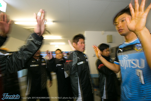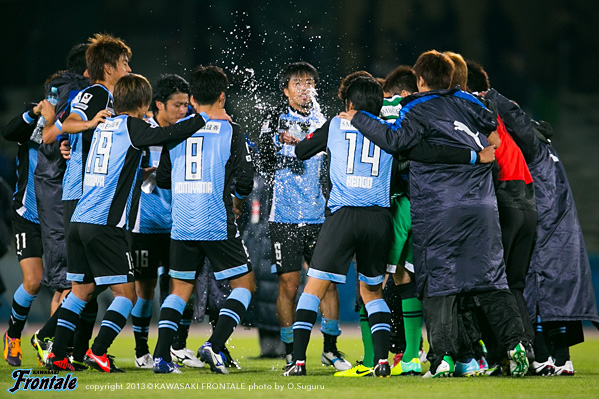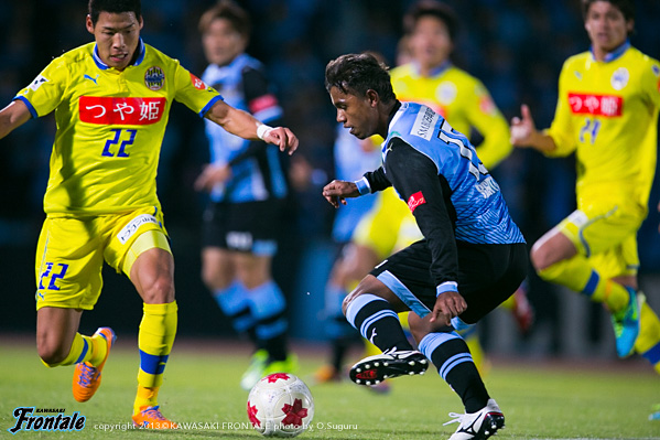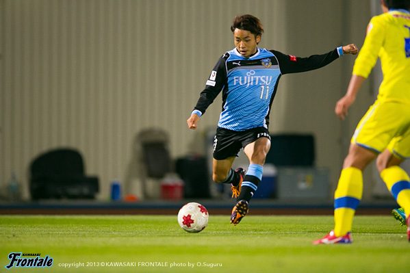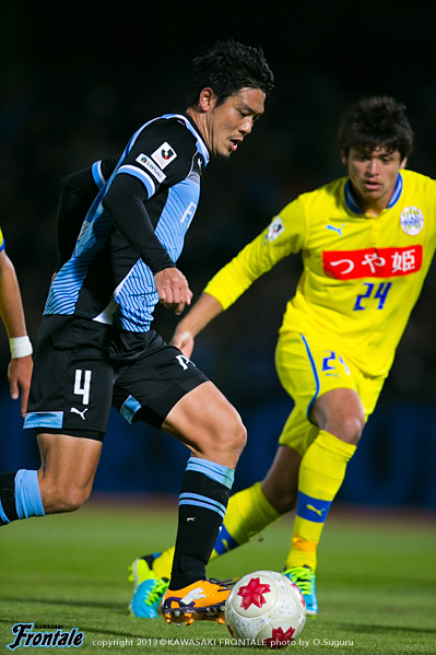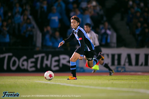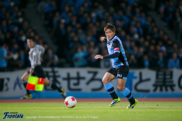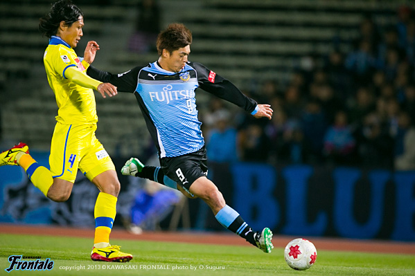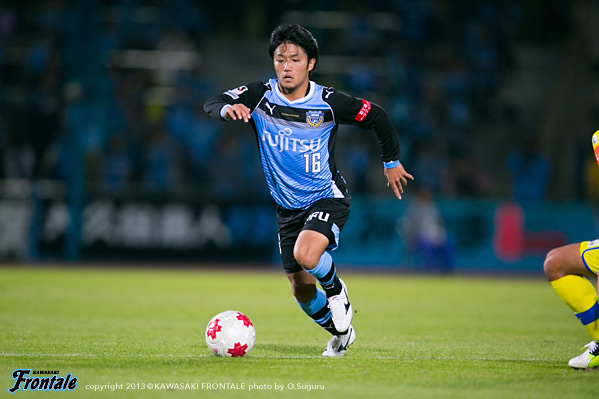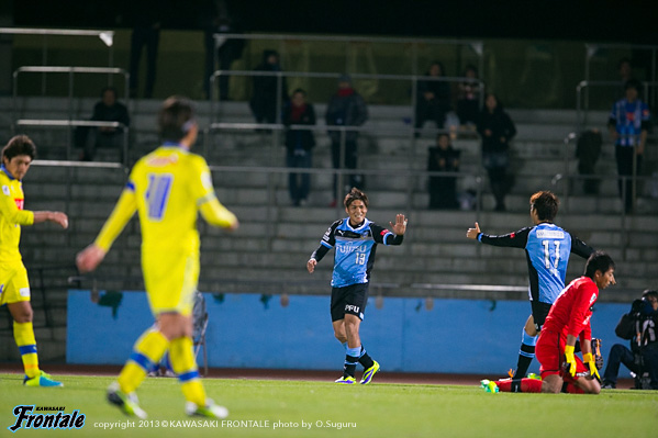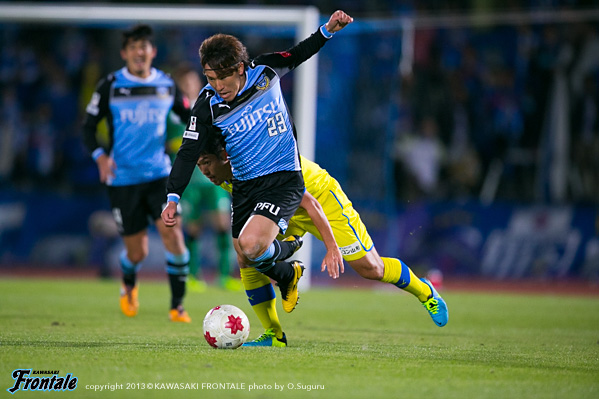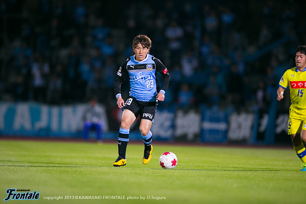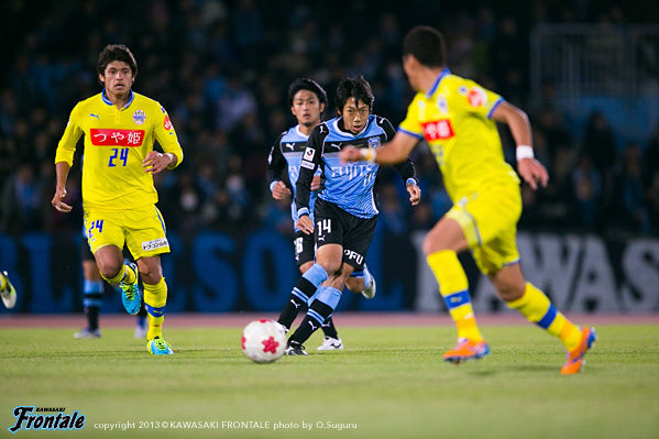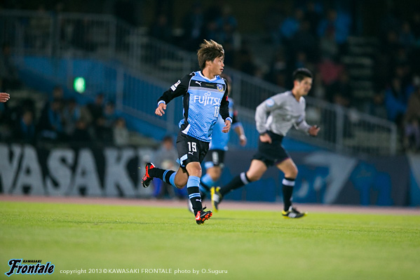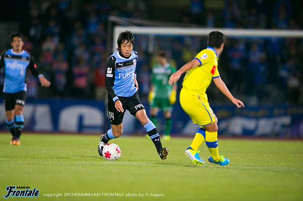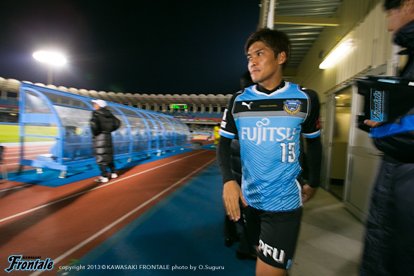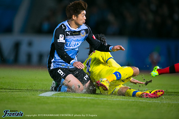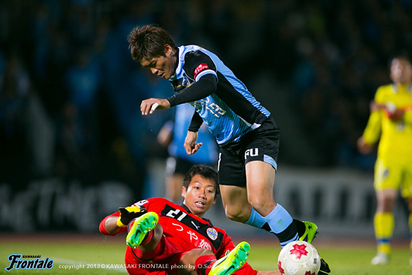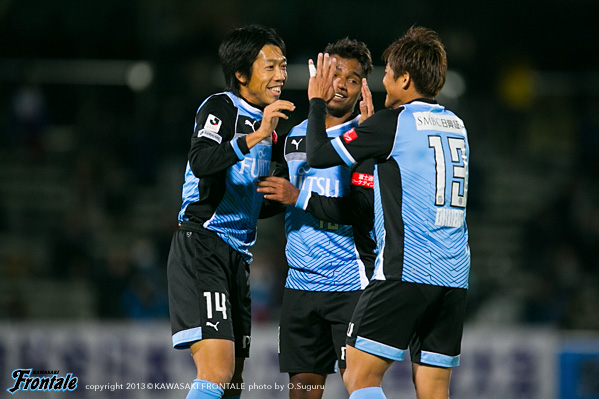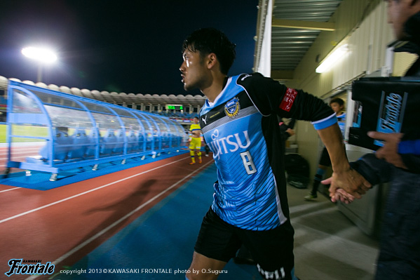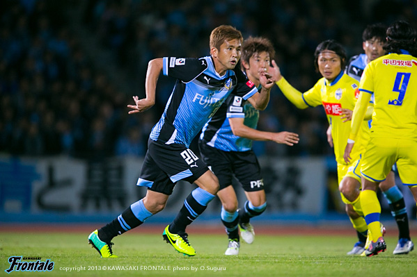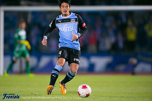 - ボールの回りがあまり良くなくて、全体的に張っているという感じはあった。でもそれはヤジ(矢島卓郎)と ヨシト(大久保嘉人)だから仕方ない部分もある。だから中盤にちょっと降りて、リョウタ(大島僚太)とマサキ(山本真希)が大変そうだったから、どちらかというとそちらに参加してという。自分たちの時間を作りたいということで、向こうがガンガン来るのに合わせているところがあったので。相手の最終ラインがすごく浅かったので、それは前半から見てて、あれだけ前から行くということは最終ラインを上げないと前からいけないから。チャンスになったのはああいう1本裏に行ったりとか、当てて落として、ということだったので。背中に走れる選手はヨシトとユウ(小林悠)とレナトといるから。オレが入った時、そこをシンプルに使って相手を下げさせれば中盤の所がもう少し空くかなと思って。2点目のところは、前半から見ていて、余裕を持ってやっていたというか、相手の最終ラインがね。ボンボン蹴るタイプのセンターバックではないので、行ったら行けるかなと思って。プレスに行ったら取れるかなと思って。入れ替わって行こうとしたら何か倒れて。でもヨシトがかっさらって行ってくれた。