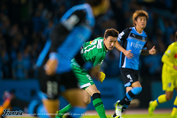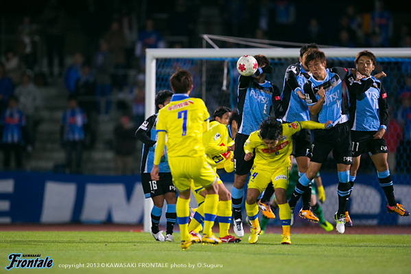 フロンターレのスターティングメンバーは、大久保と矢島の2トップ、左ワイドにレナト、右に小林、中盤センターは山本と大島のコンビ、最終ラインは登里-井川-中澤-小宮山、GK西部。立ち上がり1分、フロンターレの攻撃。登里のドリブル突破からカウンターへ。左サイドから早いボールを入れるが、ゴール前の矢島には合わず。3分、レナトの左コーナーキックのこぼれ球を拾った大島がシュートを狙うがDFにブロックされる。7分、自陣から小林が裏のスペースを狙ったボールを入れるが、抜け出した大久保はオフサイドの判定。8分、中盤でボールカット。ショートカウンターから小林の右サイドからの折り返しを大久保が受けるが、惜しくもシュートに持ち込めず。9分、山形の攻撃。右サイドから崩しを狙われるが井川が対応。10分、リスタートの流れから秋葉に強烈なシュートを打たれるが、中澤が顔面でブロック。11分、キムのロングシュートは大きく外れる。13分、パスをつながれロメロにスルーパスを入れられるが、走り込んだ中島には登里が対応。14分、フロンターレの攻撃。レナトの左サイドからのフリーキックはGKにキャッチされる。16分、山形の攻撃。自陣からボールをつながれカウンターを受けるが、守備陣が落ち着いて対応。17分、パスをつながれ最後は秋葉にミドルシュートを打たれるが大きく外れる。18分、中盤でボールを奪われ萬代のラストパスを受けた中島にシュートを打たれるが、ここはGK西部が止める。19分、フロンターレの攻撃。縦パス一本から矢島が抜け出し左サイドから折り返すが、このボールはGKにキャッチされる。20分、山形の攻撃。右サイドからアーリークロスを入れられるが井川が対応。GK西部がキャッチ。21分、左サイドからのフリーキックの場面。中村太にボールを入れられるがオフサイドの判定。24分、フロンターレの攻撃。中澤のロングフィードに小宮山が右サイドから走り込むが、惜しくもタイミングが合わず。25分、中盤のこぼれ球に大久保が反応してドリブルをしかけるがシュートに持ち込めず。