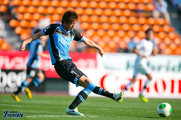 後半スタートから田中裕をボランチに配し、大久保をトップに据えた4-2-3-1のフォーメーションにチェンジ。46分、フロンターレの攻撃。大久保のパスに反応したレナトが左サイドからしかけてシュートに持ち込むがDFにブロックされる。47分、小林が右サイドでボールキープ。ラストパスを入れるが大久保には合わず。49分、大分の攻撃。高松のキープから丸谷にフリーで抜け出されるが伊藤がぎりぎりのところでクリア。50分、フロンターレの攻撃。登里のドリブル突破から決定的な折り返しを入れるがクリアされる。さらにセカンドボールをつないでスルーパスに抜け出した登里が左サイドからシュートを放つがGKに止められる。51分、レナトが左サイドからドリブルでしかけてシュート性のボールを入れるが大久保に合わず。52分、田中裕のボール奪取からカウンターへ。大久保のラストパスを受けたレナトがシュートを放つが、GKにキャッチされる。迎えた53分、右サイドの田中裕がアーリークロス。このボールを受けた大久保がトラップから反転。左足でシュートを決めて同点に追いつく。(1-1) 54分、フロンターレの攻撃。裏のスペースへのボールに大久保が追いつき、パスをつないで中村がスルーパスを狙うが小林はオフサイド。55分、中盤でボールを奪って中村がスルーパスを入れるが、惜しくも小林には合わず。57分、大分の攻撃。中盤右サイドからのフリーキックの場面。木村のボールは大きく外れる。58分、フロンターレの攻撃。中村の裏へのボールに登里が抜け出し折り返す。大久保の流したボールに實藤が合わせるがシュートはゴール上に外れる。59分、中盤で大久保がミドルパス。うまくトラップしたレナトがシュートを放つがDFに当たって外れる。60分、左コーナーキックの場面。中村からのボールを中澤がヘッドで合わせるがGKにキャッチされる。62分、中村を起点としたカウンターから右サイドの小林がラストパス。大久保が流れながらシュートを放つがGKにセーブされる。64分、大分の攻撃。カウンターから左サイドの村井にドリブルをしかけられるが實藤がマークについて稲本がクリア。