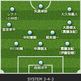 | 西部 洋平 | 21 | 0 | 0 | 0 | GK | 0 | 0 | 0 | 21 | 丹野 研太 |