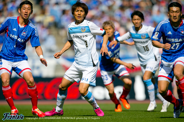 24分、フロンターレの攻撃。中盤からレナトがドリブルで持ち込むがDFに挟み込まれる。28分、横浜FMの攻撃。ボールをつながれ押し込まれ、最後は中町にミドルシュートを打たれるがゴール上に外れる。30分、ボールをつながれ富澤に裏のスペースにボールを入れられるが、このボールは登里が対応。33分、右コーナーキック。中村俊のボールをファーサイドで栗原に折り返されるが、このボールはゴール前を通過。34分、カウンターを狙われるが中村俊には山本が対応。35分、中盤でボールを奪われカウンターを狙われるが、齋藤には中村が対応。37分、フロンターレの攻撃。ボールをつないでレナトが左サイドから折り返し。ファーで小林が落として矢島がトラップするが、惜しくもシュートに持ち込めず。38分、横浜FMの攻撃。サイドチェンジを狙われるが小林祐には登里が対応。40分、自陣でボールを奪われ右サイドの小林祐にクロスを入れられるが實藤がクリア。43分、中村俊のアーリークロスはGK杉山がキャッチ。43分、フロンターレの攻撃。直後に反撃をかけ、レナトが前線でボールをキープするがラストパスにつなげられず。44分、横浜FMの攻撃。中盤でボールを奪われカウンターを受け、スルーパスに反応したマルキーニョスに右サイドからシュートを打たれるがGK杉山がセーブ。危ない場面だった。しかし45分、右サイドからのコーナーキックの場面。中村俊のボールをニアサイドで富澤にヘッドで合わせられ、先制点を奪われる。(0-1) アディショナルタイム1分。立ち上がりから中盤でボールを奪われ、横浜FMにボールを持たれて押し込まれる展開が続き、どうにかしのいでいたものの終盤、コーナーキックから失点。0-1で前半を折り返した。