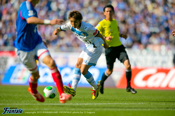 フロンターレのスターティングメンバーは、トップに矢島、その下に中村、ワイドは左にレナト、右に小林、中盤センターは山本と大島のコンビ、最終ラインは登里-伊藤-實藤-田中裕、GK杉山。立ち上がり2分、フロンターレの攻撃。右サイドでボールをつないで裏のスペースに抜け出した小林が折り返しを入れるがDFにブロックされる。3分、相手の攻勢をしのいでカウンターを狙うが、レナトのサイドチェンジは山本には合わず。5分、横浜FMの攻撃。左サイドの齋藤への裏へのボールは田中裕が対応。6分、中盤左サイドの中町のボールはGK杉山がキャッチ。7分、フロンターレの攻撃。ボールを細かくつないで登里がドリブルをしかけるがファールで止められる。8分、ペナルティエリア左前からのフリーキック。中村のシュートは壁に当たって外れる。9分、横浜FMの攻撃。兵藤にスルーパスを狙われるがマルキーニョスには實藤が対応。10分、右コーナーキック。中村俊のボールはそのままラインを割る。13分、中盤からのフリーキック。中村俊のボールは矢島がクリア。15分、ボールをつながれ押し込まれるが、中村俊には山本が対応。17分、左サイドから崩しを狙われ齋藤にクロスを入れられるが、このボールは大きく外れる。18分、フロンターレの攻撃。中村が中盤から裏のスペースにボールを入れるが、走り込んだレナトには届かず。19分、リスタートの流れからパスをつなぐが大島はラストパスに持ち込めず。20分、横浜の攻勢をしのいでカウンターへ。レナトがドリブルでボールを運び左サイドから折り返すが、矢島はDFにカバーされミートできず。23分、横浜FMの攻撃。中盤右からのフリーキック。中村俊のボールは山本がクリア。