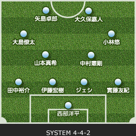| 西部 洋平 | 21 | 0 | 0 | 0 | GK | 0 | 0 | 0 | 1 | 楢﨑 正剛 |