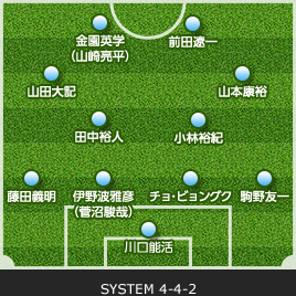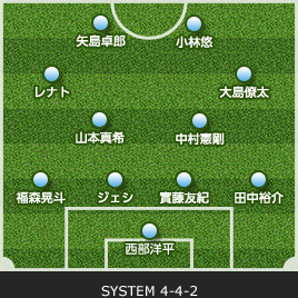 | GK/西部 洋平 | 21 | 0 | SUB | 0 | 21 | GK/八田 直樹 | ||||