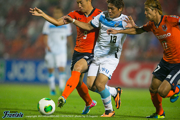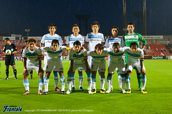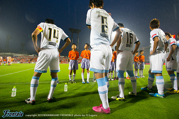 フロンターレのスターティングメンバーは、トップに大久保、その下に中村、左サイドにレナト、右に小林、中盤センターは稲本と山本のコンビ、最終ラインは登里-伊藤-中澤-實藤、GK西部。立ち上がり1分、大宮の攻撃。自陣でボールを奪われ右サイドからパスをつながれ、折り返しを受けた青木がシュート。DFに当たってコースが変わるがGK西部がセーブ。3分、フロンターレの攻撃。スローインの流れから中村がレナトとワンツーを狙うがボールはつながらず。5分、稲本のロングフィードに右サイドの小林が追いつくが、折り返しはDFにクリアされる。6分、中澤のロングフィードに大久保が走るがボールを収められず。7分、大宮の攻撃。サイドチェンジから右サイドの今井にクロスを入れられるが實藤が対応。8分、渡邉の右コーナーキックからゴール前で混戦となるが、こぼれ球はGK西部がキャッチ。迎えた8分、フロンターレの攻撃。登里の中盤からの縦パスを左サイドで受けた中村がすぐさま折り返し。ファーサイドに走り込んだ小林が右サイド角度のないところからシュートを決めて先制点を奪う。(1-0) 11分、フロンターレの攻撃。相手陣内でパスをつなぎ、レナトが左サイドから強烈なミドルシュートを放つが惜しくもゴール右に外れる。13分、中盤でルーズボールを拾ってレナトを起点にカウンターへ。中村がドリブルで持ち込むが惜しくもDFに止められる。14分、中村が中盤から前線にボールを送るがレナトには通らず。16分、大宮の攻撃。中盤でボールを奪われショートカウンターを浴び、左サイドのチョにシュートを打たれるがGK西部がセーブ。16分、さらに左サイドから攻勢をかけられクロスを入れられるがゴール前で稲本がクリア。19分、セカンドボールを拾われ左サイドからスルーパスを狙われるが、GK西部が飛び出しキャッチ。21分、今度は右サイドから崩しをかけられ金澤に決定的な折り返しを入れられるが、ゴール前で實藤が対応。危ない場面だった。