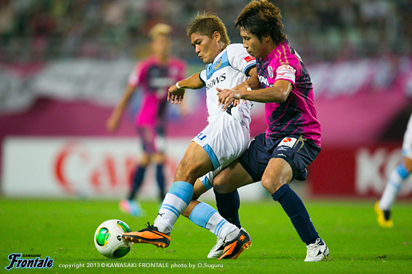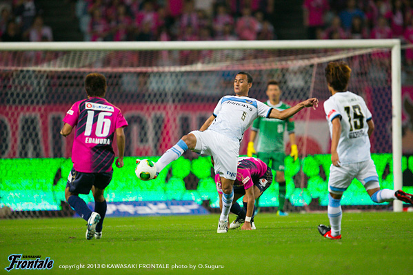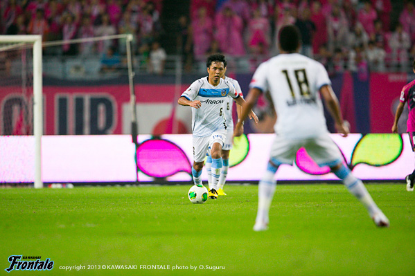 後半立ち上がり46分、C大阪の攻撃。右サイドからのフリーキックの場面。エジノのゴールに向かうボールはGK西部がキャッチ。47分、フロンターレの攻撃。相手のルーズボールの処理のミスを突いてカウンターへ。大久保が左サイドから切り返して左足でシュートを放つが、これは大きく外れる。48分、C大阪の攻撃。一瞬のスキを突かれて左サイドから柿谷にしかけられるが、シュートはゴール右に外れる。51分、フロンターレの攻撃。セカンドボールを拾ってパスをつなぐがラストパスにつなげず。52分、右サイド裏に抜け出した田中裕が折り返し。大久保を経由して左サイドの登里がシュートを放つが、惜しくもGKの攻守に阻まれる。52分、C大阪の攻撃。枝村に左サイドから勝負をしかけられるが、ここは田中裕が対応。53分、サイドチェンジから右サイドの山口にドリブル突破を許しクロスを入れられるが、GK西部がパンチングでしのぐ。55分、フロンターレの攻撃。カウンターからパスをつなぎ、小宮山が左サイドからスルーパスを狙うが登里には合わず。56分、C大阪の攻撃。中盤から扇原に浮かし球を入れられるが、エリア内で小宮山がクリア。56分、シンプリシオのミドルシュートはゴール上に外れる。58分、フロンターレの攻撃。パスを細かくつないで左サイドの小宮山が低い折り返しを入れるがGKにキャッチされる。60分、C大阪の攻撃。右サイドから崩しをかけられ山口に折り返しを狙われるが、山本がブロック。61分、C大阪の攻撃。右コーナーキックの場面。酒本のボールからこぼれ球を拾われ、柿谷のヒールパスから枝村に抜け出されるがGK西部が飛び出しキャッチ。65分、稲本に代えてアランが入り、中村がボランチの位置へ。66分、フロンターレの攻撃。相手のミスに乗じて大久保が右サイドからドリブル突破。パスをつないで最後は折り返しを受けた中村が左足でミドルシュートを放つが、これは大きく外れる67分、C大阪の攻撃。柿谷とのコンビネーションから杉本にゴール前に入り込まれてシュートを打たれるが、これはゴール右に外れる。危ない場面だった。69分、フロンターレの攻撃。ボールをつないで押し込むものの、ラストパスを入れられず。