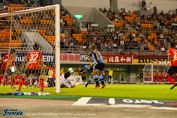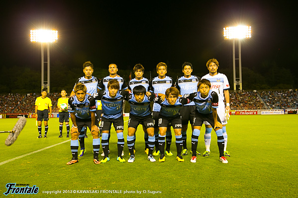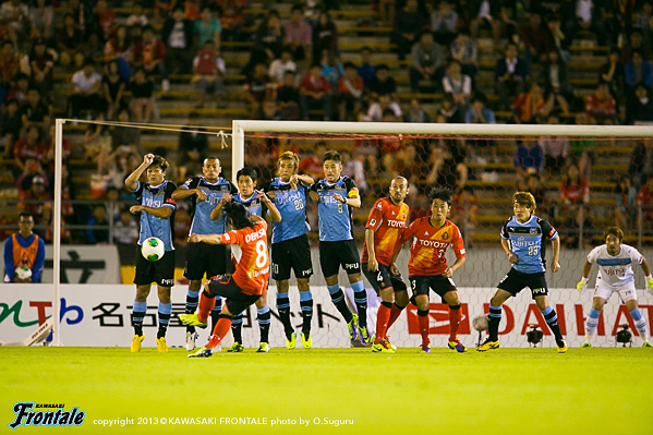 フロンターレのスターティングメンバーは、大久保と矢島の2トップ、中盤左に小林、右に森谷、ボランチは稲本と山本のコンビ、最終ラインは登里-井川-ジェシ-田中裕、GK杉山。立ち上がり1分、フロンターレの攻撃。早いテンポでボールをつなぎ森谷が右からサイドチェンジを狙うがDFにクリアされる。3分、名古屋の攻撃。ペナルティエリア左前からのフリーキック。藤本のシュートは壁に当たって外れる。4分、フロンターレの攻撃。名古屋の攻勢をしのぎ森谷のドリブル突破から反撃を狙うが、ファールで止められる。5分、名古屋の攻撃。藤本にスルーパスを狙われるがジェシが対応。6分、ボールをつながれ左サイドの阿部にクロスを入れられるが守備陣が対応。7分、サイドチェンジから左サイド阿部のクロスをフリーのケネディにヘッドで合わせられるが、ボールはゴール左に外れる。危ない場面だった。8分、パスをつながれ押し込まれるが守備陣が対応。9分、牟田のロングシュートは大きく外れる。10分、自陣でボールを奪い返されるが最終ラインで落ち着いて対応。13分、細かくパスをつながれ反転した永井にシュートを打たれるが、ジェシがブロック。ピンチをしのぐ。14分、牟田のロングスローがゴール前にこぼれるが、ジェシが落ち着いて対応。14分、フロンターレの攻撃。直後に反撃を繰り出し田中裕が長いボールを入れるが、矢島には合わず。15分、名古屋の攻撃。磯村に強烈なミドルシュートを打たれるがGK杉山がキャッチ。15分、闘莉王の縦パスを受けた永井にシュートを打たれるがGK杉山がキャッチ。16分、自陣でボールを奪われ押し込まれるが守備陣がしのぐ。17分、フロンターレの攻撃。直後にカウンターへ。小林がドリブル突破。右サイドの森谷がリターンパスを入れるがゴール前でクリアされる。18分、名古屋の攻撃。小川の左コーナーキックを牟田にヘッドですらされるが、ボールはクロスバーに当たって外れる。20分、フロンターレの攻撃。ボールをつないで左サイドの登里がクロスを狙うが、DFに当たってラインを割る。21分、森谷の左コーナーキックをジェシが触るが、ボールはGKにキャッチされる。