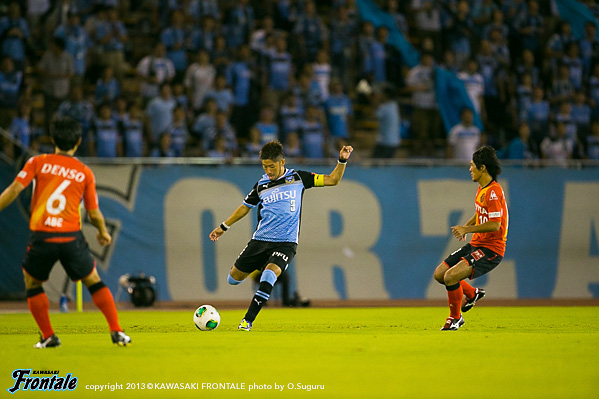 21分、名古屋の攻撃。直後にカウンターを浴びてラストパスを入れられるがオフサイドの判定。24分、フロンターレの攻撃。右サイドからのフリーキック。森谷のボールがゴール前に入るが、DFにクリアされる。25分、フロンターレの攻撃。中盤で大久保がつなぎ山本がスルーパスを入れるが、惜しくも小林には通らず。28分、名古屋の攻撃。牟田のロングスローからセカンドボールをつながれ、闘莉王にシュートを打たれるがゴール左に外れる。31分、フロンターレの攻撃。中盤で稲本がボールカット。カウンターを狙うがファールで止められる。迎えた33分、フロンターレの攻撃。名古屋に攻勢をかけられるが守備陣がしのぎ、山本のクリアボールがそのまま中盤の大久保へ。カウンターから大久保がドリブルで持ち込みDFをかわしてシュートを決め、フロンターレが先制点を挙げる。(1-0) 35分、フロンターレの攻撃。左サイドから崩しをかけてクロスのこぼれ球に小林が反応するが、シュートはDFにブロックされる。36分、大久保を起点に攻撃をしかけるがラストパスにつながらず。39分、自陣でボールを奪ってカウンターを狙うが、森谷のパスは田中裕に通らず。41分、名古屋の攻撃。攻勢をしのがれカウンターを受け永井に突破されるが、右サイドからのクロスはGK杉山がキャッチ。41分、フロンターレの攻撃。直後に反撃。登里の左サイドからのクロスを矢島がすらすが大久保には合わず。43分、名古屋の攻撃。中盤でボールを奪われるが守備陣が落ち着いて対応。45分、フロンターレの攻撃。右サイドでパスをつなぎ、最後は大久保が切れ込み左足を振り抜くがシュートはゴール右に外れる。アディショナルタイム2分。45+1分、フロンターレの攻撃。左サイドで登里がキープ。深い位置から折り返すが惜しくもGKにキャッチされる。45+2分、名古屋の攻撃。藤本にゴール前にボールを入れられるがジェシが対応。立ち上がりから勢いよく出てくる名古屋に押し込まれる展開となるが、相手が前がかりになったところでクリアボールがそのままカウンターになり、このワンチャンスを大久保が仕留めて先制。1-0で前半を折り返した。