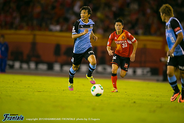 後半立ち上がり46分、名古屋の攻撃。右サイドから崩しを狙われるが守備陣が対応。47分、フロンターレの攻撃。登里が左サイドから裏のスペースを狙うが、矢島はオフサイドの判定。49分、名古屋の攻撃。ボールをつながれ右サイドからクロスが入るが守備陣が対応。50分、サイドチェンジから右サイドの田中隼にクロスを入れられるが山本がクリア。51分、フロンターレの攻撃。大久保がボールキープ。ラストパスを狙うが小林には通らず。52分、名古屋の攻撃。パスをつながれ小川にシュートを打たれるが、井川が体に当ててGK杉山がキャッチ。53分、左サイドから崩しをかけられ小川に決定的な折り返しを入れられるが、井川が体を張ってブロック。ピンチをしのぐ。54分、小川の左コーナーキックをGK杉山がはじきこぼれるが、守備陣がぎりぎりのところで防ぐ。55分、小川の左コーナーキックはGK杉山がパンチング。さらに藤本の右コーナーキックからこぼれ球を小川に詰められるが、シュートは大きく外れる。56分、右サイド田中隼の突破は登里が対応。57分、藤本の右コーナーキックは守備陣が対応。セカンドボールを拾われるが、ケネディのシュートは大きく外れる。58分、中盤でボールを奪われ右サイドからのクロスをケネディにヘッドで合わせられるが、シュートは大きく外れる。61分、中村直のミドルシュートはGK杉山がキャッチ。62分、フロンターレの攻撃。パスをつないで大久保が縦パスを入れ、森谷が落として田中裕が右サイドからシュートを放つが、ボールは惜しくもゴール左に外れる。63分、矢島に代えて伊藤が入り左サイドバック。登里がひとつ前のポジションへ。64分、名古屋の攻撃。サイドチェンジから阿部にアーリークロスを入れられるが、ここはジェシがクリア。64分、ボールをつながれ最後は磯村にミドルシュートを打たれるが、井川が体を張ってブロック。
