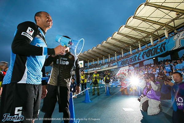 - やっぱり結果だけど、勝てたことが大きい。最後のゴールも、今にも入るんじゃないかってくらい押せ押せの雰囲気でサポーターのみんなが応援してくれてたから入ったんだと思う。選手たちもみんな勝ちたいって気持ちが前に前に行ってたから、気持ちで入ったゴールだった。ゴールを決めてサポーターのみんなのところへ行ったのは、少し泣きそうになったくらい嬉しかったから。こんなのは久々。得点の記録がオウンゴールから自分のゴールになったときは、嬉しかった。横断幕の数字も伸ばしていきたいね。今のフロンターレの攻撃は、たくさん点を取るし、僕らのパス回しとか、見ててすごく楽しくなると思うし、ハマると思うので、ぜひひとりでも多く友だちや知り合いを連れて観に来てほしい。そういうプレーを僕たちは毎試合やらないといけないし、やるつもりで練習から取り組んでいるので、これからも一緒に戦いましょう。
