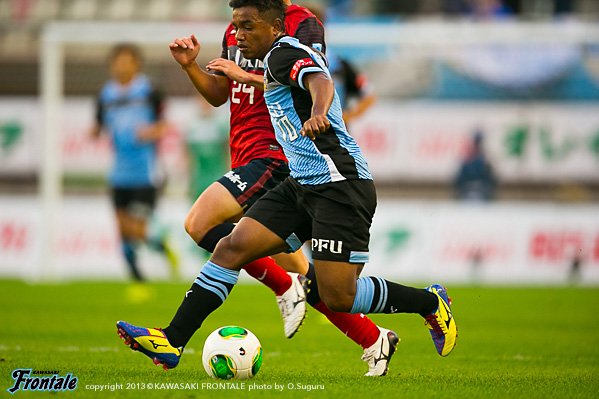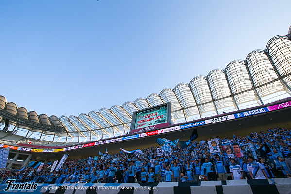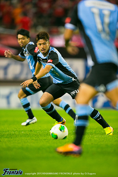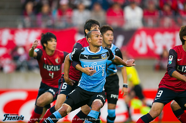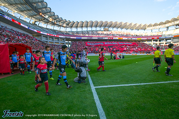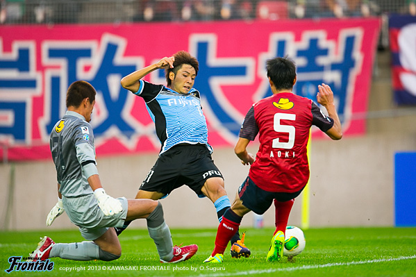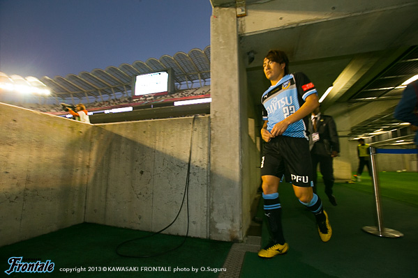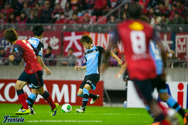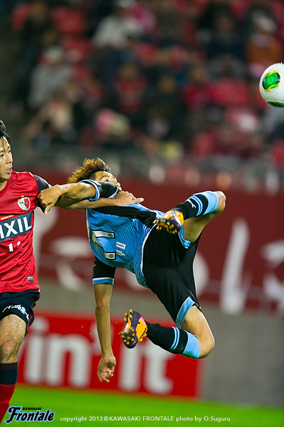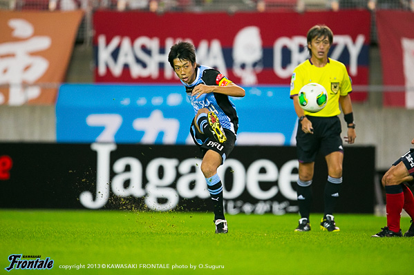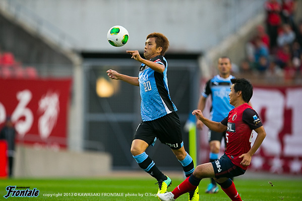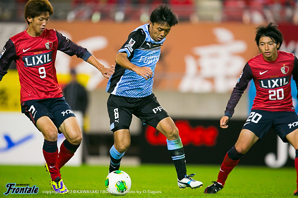 フロンターレのスターティングメンバーは、トップの大久保、2列目にレナト-中村-山本-小林、中盤底に稲本、最終ラインは登里-伊藤-ジェシ-田中裕、GK杉山。立ち上がり1分、フロンターレの攻撃。稲本の中盤からの浮かし球を受けた山本が右サイドから抜け出し、角度のないところからシュートを放つが惜しくもGKにセーブされる。さらに大久保がドリブルから強烈なミドルシュートを放つが、ここもGKにセーブされる。2分、左コーナーキックのクリアボールを拾い、レナトが左サイドから折り返すがゴール前ではね返される。4分、鹿島の攻撃。中盤での攻防から遠藤にボールを入れられるがジェシが対応。GK杉山がキャッチ。5分、フロンターレの攻撃。直後に反撃。左サイド裏に抜け出したレナトが折り返しを入れ、小林がヘッドで合わせるがボールはゴール上に外れる。6分、中盤でボールをつないで山本が絶妙のスルーパス。小林が抜け出し右足を合わせるが、惜しくもGKに止められる。9分、鹿島の攻撃。ペナルティエリア前からのフリーキック。柴崎のシュートは壁に当たり遠藤のシュートは枠を外れる。11分、フロンターレの攻撃。鹿島の攻勢をしのぎ後ろからつないでいくが稲本はファールで止められる。12分、鹿島の攻撃。一瞬のスキを突かれジュニーニョのドリブル突破から左サイドの土居にクロスを入れられるが、登里が戻りぎりぎりのところでクリア。危ない場面だった。13分、大迫のミドルシュートはゴール左に外れる。15分、フロンターレの攻撃。中村のカットからカウンターへ。レナトからパスを受けた大久保が左サイドから切れ込みミドルシュートを放つが枠を外れる。さらに攻勢をかけてレナトがミドルシュートを放つが、これもゴール上に外れる。16分、鹿島の攻撃。自陣でボールを奪い返され圧力をかけられるが、守備陣が落ち着いて対応。17分、さらに自陣でボールを奪われ大迫にシュートを打たれるが、ジェシと伊藤で挟みこみGK杉山がキャッチ。19分、フロンターレの攻撃。稲本がサイドチェンジ。右サイドから攻勢をかけるがフィニッシュにつながらず。すると迎えた20分、鹿島の攻撃。自陣でのバックパスを拾われ土居にシュートを決められ先制点を奪われる。(0-1)