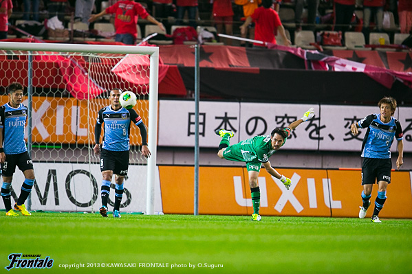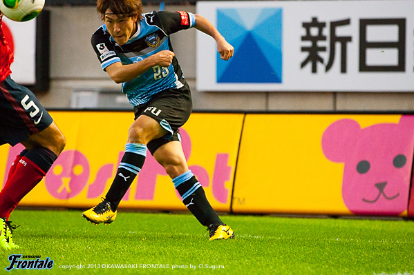 24分、フロンターレの攻撃。中盤左サイドからのフリーキックの場面。中村のボールはDFにクリアされる。25分、クリアボールを拾われショートカウンターを狙われるが、大迫はオフサイド。27分、フロンターレの攻撃。早いリスタートから右サイド小林が抜け出し、戻しを受けた大久保がシュートに持ち込むが惜しくもゴール左に外れる。29分、田中裕が長い距離をドリブル突破。攻勢をかけるがラストパスにつながらず。30分、鹿島の攻撃。小笠原の中盤からのフリーキックを中田にヘッドで折り返されるが、GK杉山がキャッチ。30分、フロンターレの攻撃。直後に反撃。裏のスペースにボールが入り山本が走り込むが、惜しくも触れず。31分、中盤でルーズボールを拾い中村がスルーパスを送るが、小林は惜しくもオフサイドの判定。32分、鹿島の攻撃。自陣でボールを奪われ遠藤にシュートを打たれるが、ジェシの足に当たりGK杉山がキャッチ。危ない場面だった。33分、パスをつながれ押し込まれるが守備陣が落ち着いて対応。36分、左サイドから崩しを狙われるが土居にはジェシが対応。38分、フロンターレの攻撃。右サイドからのフリーキック。レナトのボールに大久保が飛び込むがその前でクリアされる。39分、左コーナーキックの場面。レナトのボールはGKがパンチング。クリアボールを拾ってレナトが再びクロスを入れるが、ジェシのヘッドはゴール上に外れる。40分、鹿島の攻撃。中盤でボールを奪われショートカウンターを受けるが、右サイドからのクロスは田中裕がクリア。42分、プレッシャーをかわして中村を起点にカウンターを狙うが、レナトのラストパスは中村には通らず。44分、中盤でパスをつながれ右サイド遠藤にクロスを入れられるが、稲本が戻りぎりぎりのところでクリア。危ない場面だった。迎えた44分、鹿島の攻撃。スローインの流れから一瞬のスキを突かれ、ジュニーニョの左サイドからの折り返しを大迫に合わせられ追加点を奪われる。(0-2) 立ち上がりから積極的に攻撃をしかけていくが、チャンスをものにできず。すると鹿島の前線からのプレッシャーにつかまり失点。前半終了間際にもリスタートの流れから一瞬のスキを突かれて失点。0-2で前半を折り返した。