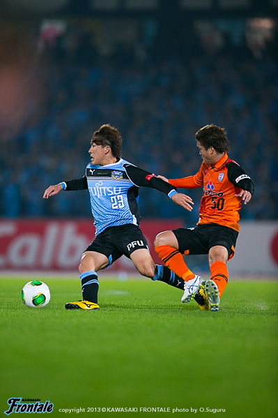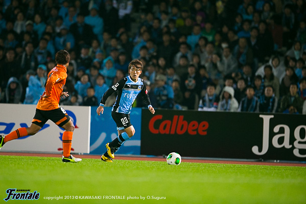 後半立ち上がり46分、フロンターレの攻撃。レナトが左サイドからドリブルをしかけるがファールで止められる。46分、左サイドで粘ったレナトが折り返し。トラップした矢島が左サイドからシュートを放つが、GKにキャッチされる。47分、左サイドでボールを受けたレナトがキープ。そのまま角度のないところからシュートを放つがゴール上に外れる。50分、清水の攻撃。ゴール右前からのフリーキックの場面。河井のボールはゴール前でクリア。セカンドボールを拾われるが守備陣が対応。51分、河井の左コーナーキックから混戦となるが、井川がこぼれ球に対応。53分、早いリスタートから攻勢をかけられるがGK西部が飛び出しキャッチ。54分、フロンターレの攻撃。登里が左サイドからドリブルをしかけるがファールで止められる。55分、清水の攻撃。中盤でボールを奪われショートカウンターを狙われるが、伊藤翔には中澤と登里で挟み込み対応。危ない場面だった。56分、フロンターレの攻撃。一瞬のスキを突いて大久保のスルーパスに抜け出したレナトが左サイドからシュートを放つが、惜しくもゴール左に外れる。57分、清水の攻撃。カウンターから押し込まれ最後はラドンチッチにシュートを打たれるが、登里が足に当てて枠を外れる。58分、フロンターレの攻撃。清水のセットプレーをしのいでカウンターへ。小林が右サイドからドリブルをしかけるが惜しくもラストパスにつながらず。60分、ボールをつないでレナトが左サイドから浮かし球を入れるが矢島は届かず。62分、サイドチェンジからレナトが左サイドをドリブル突破。クロスを入れるが惜しくも矢島には合わず。 63分、セカンドボールをつないで押し込むもののラストパスにつながらず。しかし迎えた65分、フロンターレの攻撃。パスをつないで相手ゴール前に押し込み、山本が右サイドからゴール前にボールを入れ、ファーサイドの大久保がDFの頭上からヘッドで合わせ先制点を挙げる。(1-0) 66分、清水の攻撃。右サイドから攻勢をかけられGK西部がクロスをはじき、こぼれ球を村田に詰められるがシュートは味方に当たって外れる。危ない場面だった。