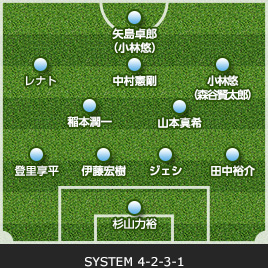 | 杉山 力裕 | 1 | 0 | 0 | 0 | GK | 0 | 0 | 0 | 1 | 山岸 範宏 |