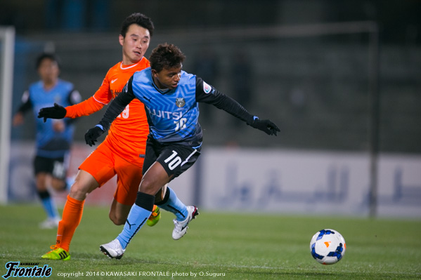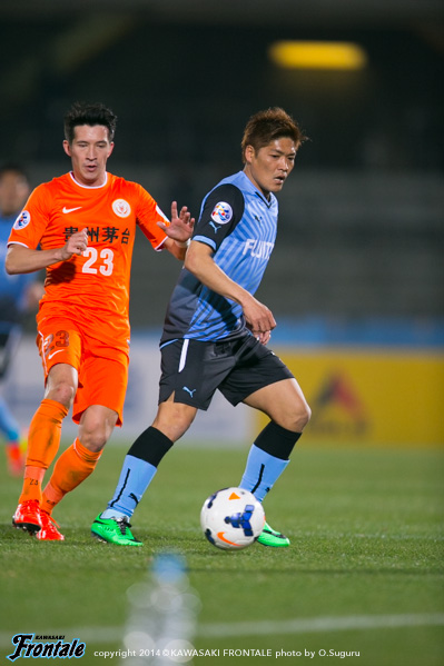 フロンターレのスターティングメンバーはトップに大久保、その下に中村、左ワイドにレナト、右に小林、中盤センターはパウリーニョと大島のコンビ、最終ラインは登里-井川-ジェシ-田中裕、GK西部。立ち上がり2分、フロンターレの攻撃。レナトが左サイドから長いボールを入れるが、走り込んだ中村には届かず。3分、貴州の攻撃。中盤右サイドからのフリーキックの場面。ヤン ハオのボールはGK西部がパンチング。貴州のファールとなる。4分、フロンターレの攻撃。レナトが左サイドからドリブルをしかけてクロスを入れるがDFにクリアされる。7分、貴州の攻撃。中盤でパスカットされて反撃を浴びるが登里が対応。8分、フロンターレの攻撃。中村の右コーナーキックのこぼれ球を拾ってつなぎ、パウリーニョが強烈なミドルシュートを放つがGKにセーブされ、こぼれ球に反応した小林はオフサイドの判定。9分、左サイドから崩しをかけて押し込むがラストパスにつなげられず。11分、パスをつないで田中裕が右サイドからスルーパスを狙うが中村には合わず。13分、右サイドからのフリーキックの場面。レナトの速いボールはクリアされる。13分、セカンドボールを拾ってパスをつなぎ、大久保が強引にミドルシュートを放つが大きく外れる。16分、貴州の攻撃。中盤右サイドからのフリーキックの場面。ヤン ハオのボールは中村がカット。16分、フロンターレの攻撃。直後にカウンターへ。ボールをつないで大島がラストパス。小林が受けるが、惜しくもシュートに持ち込めず。17分、ボールをつないで右サイドの田中裕がクロス。小林がトラップするがシュートに持ち込めず。17分、貴州の攻撃。直後にカウンターを狙われるが登里が対応。18分、フロンターレの攻撃。パスをつないで大久保が左足でミドルシュートを放つがゴール右に外れる。21分、中盤右サイドからのフリーキックの場面。レナトのボールにジェシが飛び込むが、ボールは枠に飛ばず。