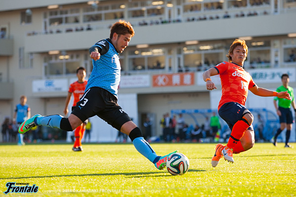 27分、ルーズボールを拾った大島がラストパスを入れるが惜しくも大久保には通らず。すると迎えた28分、大宮の攻撃。右サイドから崩しをかけられ、ワンツーから抜け出した家長にシュートを決められ追加点を奪われる。(1-2) 30分、大宮の攻撃。ボールを奪われカウンターを浴びるが中澤が戻って対応。32分、フロンターレの攻撃。中央からのフリーキックの場面。レナトが直接狙うがシュートはDFに当たってゴール上に外れる。33分、フロンターレの攻撃。コーナーキックのこぼれ球に合わせたパウリーニョがダイレクトで狙うが、シュートは枠を外れる。35分、大宮の攻撃。右サイドから崩しをかけられ押し込まれるが、家長にはパウリーニョが対応。37分、カウンターからセカンドボールを拾われ渡邉の左サイドからの折り返しをラドンチッチにヘッドで合わせられる、がシュートはゴール上に外れる。危ない場面だった。39分、GKのロングボールをラドンチッチにヘッドですらされるが、ここは井川がカバーリング。41分、フロンターレの攻撃。大島がドリブル突破。スルーパスに抜け出した小林が右サイドから速いボールを入れるが、ボールはDFに当たりさらにGKに当たって外れる。惜しい場面だった。42分、さらに攻勢をかけて大久保がシュート。ルーズボールをレナトが狙うがDFにクリアされる。43分、大宮の攻撃。カウンターからラドンチッチに抜け出されるが、ここは井川がカバーリング。45分、フロンターレの攻撃。大宮の攻勢をしのいでカウンターを狙うが、左サイドのレナトは突破できず。アディショナルタイム2分。46分、フロンターレの攻撃。カウンターからパスをつないで右サイド大島がドリブルをしかけて折り返し。レナトが狙うがシュートは惜しくもDFにブロックされる。立ち上がりにコーナーキックから失点を喫したものの、反撃をかけて相手のオウンゴールを誘い、すぐさま同点に。しかし、サイドから攻勢をかけられ失点。その後はフロンターレが押し気味に試合を進めるものの、チャンスを追加点に結びつけられず。1-2で前半を折り返した。