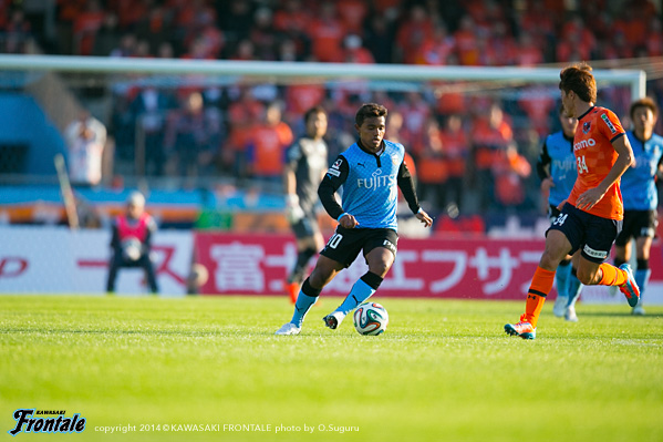 後半、福森に変えて武岡が入り、そのまま左サイドバックへ。46分、大宮の攻撃。渡邉の右コーナーキックは中村が対応。49分、フロンターレの攻撃。ボールを細かくつないでパウリーニョ、さらにレナトがシュートを放つがいずれもブロックされる。52分、パスをつないで中村のスルーパスに抜け出した田中裕が右サイドからシュート性のボールを入れるが、惜しくも大久保には合わず。54分、中村の縦パスを大久保が受けるが、ここはファールで止められる。56分、中村の浮かし球をレナトがワンタッチではたき、左サイドから抜け出した大久保がシュートを放つがDFにブロックされる。56分、レナトの左コーナーキックを受けた小林がゴール前から落ち着いてシュートを狙うが、惜しくもGKの攻守に阻まれる。57分、さらにレナトの左コーナーキックをニアサイドで小林がヘッドで合わせるが、このボールは大きく外れる。59分、フロンターレの攻撃。パスをつないで中村がドリブルで左サイドから持ち込み折り返すが、惜しくもDFにクリアされる。60分、スローインからパスをつなぎ、最後は中村が左足で狙うがミドルシュートは大きく外れる。63分、ルーズボールを拾って押し込み攻勢をかけるが、惜しくもフィニッシュに持ち込めず。67分、パウリーニョが中盤でボールを奪い返し、中村がドリブルから左足で狙うがシュートはGKにキャッチされる。フロンターレが押し込む時間帯が続き、迎えた70分。小林とのワンツーから抜け出した中村がドリブルでエリア内に入り込み、左サイドから折り返し。このボールをレナトが合わせて同点に追いつく。(2-2) 71分、大宮の攻撃。カウンターを受け左サイドから抜け出したズラタンに合わせられるが、GK杉山が体に当ててブロック。危ない場面だった。72分、フロンターレの攻撃。ボールをつないで右サイドからの折り返しを小林がオーバーヘッドで合わせるが、惜しくもGKにセーブされる。