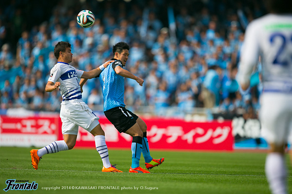 フロンターレのスターティングメンバーは、大久保と小林の2トップ、中盤左にレナト、右に森谷、ボランチは山本と大島のコンビ、最終ラインは谷口-井川-ジェシ-田中裕、GK西部。立ち上がり2分、フロンターレの攻撃。ボールを細かくつないで攻勢をかけるがラストパスはつながらず。4分、ボールを奪い返してパスをつなぐが大久保はシュートに持ち込めず。6分、早いリスタートから大島がボールをつなぎ、レナトがドリブル突破からミドルシュートを放つがゴール上に外れる。8分、甲府の攻撃。速攻を狙われるが大島が戻りパスカット。9分、ここでアクシデント。井川が負傷し、タンカで運ばれる。10分、井川に代わり中澤がピッチへ。11分、甲府の攻撃。クリスティアーノの突破はジェシが対応。14分、フロンターレの攻撃。パスをつないでボールを回していくが、ラストパスにはつながらず。15分、相手陣内でパスカット。大島からボールを受けた大久保が左足で狙うが、シュートはDFに当たって外れる。16分、甲府の攻撃。フロンターレのセットプレー直後にカウンターを狙われるが、右サイドのクリスティアーノには谷口が対応。17分、右ショートコーナーからクリアボールがこぼれクリスティアーノに狙われるが、ジェシが体に当ててシュートブロック。さらにショートコーナーから右サイド下田のクロスを青山にヘッドですらされるが、ボールはゴール左に外れる。危ない場面だった。19分、フロンターレの攻撃。大島の縦パスからセカンドボールを拾って押し込み、最後は大島が狙うがシュートはブロックされる。20分、甲府の攻撃。ルーズボールが自陣裏のスペースに転がるがGK西部が飛び出しクリア。21分、大島がつないで谷口が左サイドからクロスを入れるがDFにクリアされる。23分、甲府の攻撃。ボールをつながれ右サイドからの折り返しを稲垣に合わせられるが、ジェシがシュートブロック。24分、自陣でボールを奪われ左サイドから阿部にクロスを入れられるが谷口がクリア。24分、フロンターレの攻撃。大島が中盤から裏のスペースへボールを出し、抜け出した大久保がシュートを放つが惜しくもGKの足に当たって外れる。