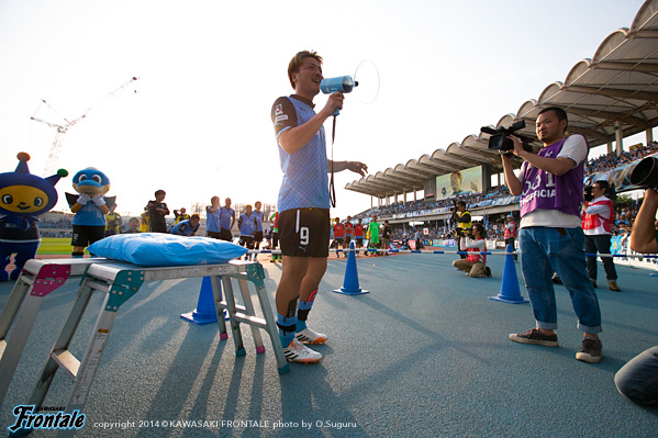 - 最後、脱水症状になってしまい、ちゃんと挨拶も出来なかったことが申し訳ない。ゴールを決めたので、マイクパフォーマンスもあったかなと残念。皆さんの前で話したかったが、初めて等々力でゴールを決めて、チームが勝利して、何か初めてフロンターレに貢献できたなと感じたし、これでやっとフロンターレの一員になれたのかなと嬉しかった。これからももっと等々力でゴールを決めて勝利に貢献したい。