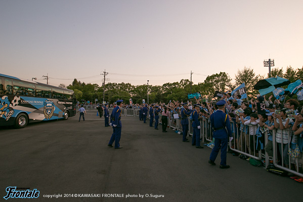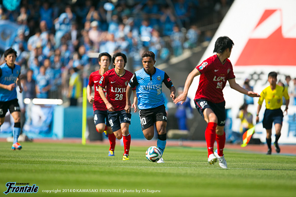 フロンターレのスターティングメンバーは、大久保と小林の2トップ、中盤左にレナト、右に森谷、ボランチは中村と大島のコンビ、最終ラインは谷口-中澤-ジェシ-田中裕、GK西部。立ち上がり2分、鹿島の攻撃。ダヴィに長い距離からシュートを打たれるが大きく外れる。迎えた3分、フロンターレのファーストチャンス。中盤から大久保に縦パスが入り、森谷がヒールで流したボールに回り込んだ小林が右サイドから技ありのシュートを決め、フロンターレが立ち上がりに先制点を挙げる。(1-0) 4分、フロンターレの攻撃。大久保が左サイドからスルーパスを入れるが小林には通らず。6分、鹿島の攻撃。最終ラインからロングフィードを入れられるがGK西部が飛び出しクリア。7分、ボールをつながれ押し込まれるが守備陣がしのぐ。8分、フロンターレの攻撃。パスをつないで小林が右サイドからクロスを入れるが、DFにクリアされる。8分、相手陣内でボールを奪い返して中村がスルーパスを狙うが大久保には合わず。9分、鹿島の攻撃。右サイドから崩しをかけられるがゴール前で守備陣がクリア。10分、フロンターレの攻撃。相手陣内でボールを奪い返して攻勢をかけるが、小林の裏のスペースへのパスは右サイド森谷に合わず。12分、鹿島の攻撃。右サイドから崩しをかけられ伊東のクロスをニアで土居に合わせられるが、ヘディングシュートは枠を外れる。迎えた16分、鹿島の攻撃。左サイドの山本にドリブルで中央に切れ込まれて右サイドに展開され、遠藤のヒールパスに反応した柴崎に角度のないところからループシュートを決められ同点に追いつかれる。(1-1) 17分、鹿島の攻撃。パスカットされカウンターを狙われるが、ダヴィにはジェシが対応。18分、右サイドからの折り返しのこぼれ球に詰めた土居にシュートを打たれるが、大きく外れる。19分、フロンターレの攻撃。中盤から大島がゴール前に浮かし球を入れるが森谷には合わず。20分、鹿島の攻撃。ボールを奪われカウンターを狙われるが、ダヴィへの縦パスはジェシが対応。21分、ダヴィのミドルシュートはジェシがブロック。22分、小笠原の左コーナーキックは谷口がクリア。