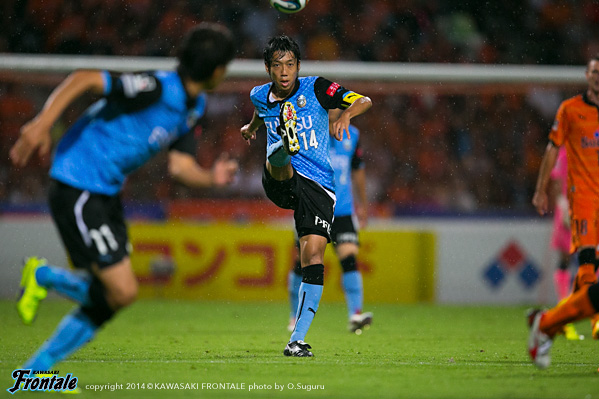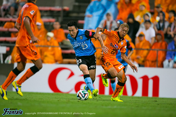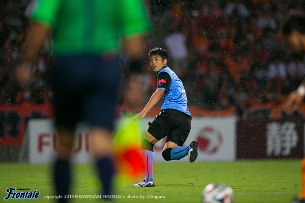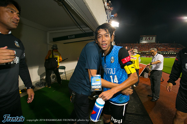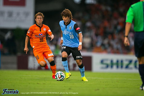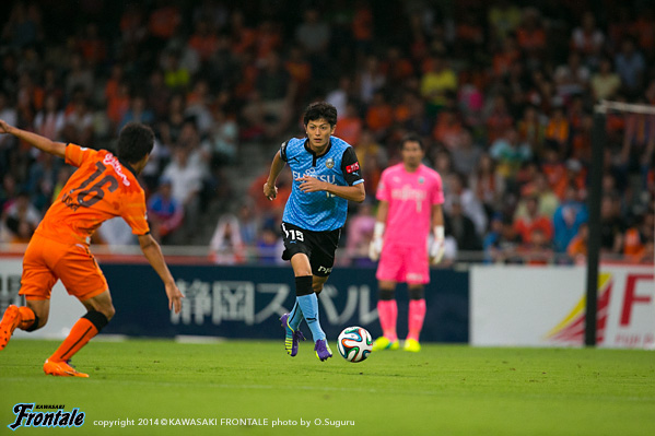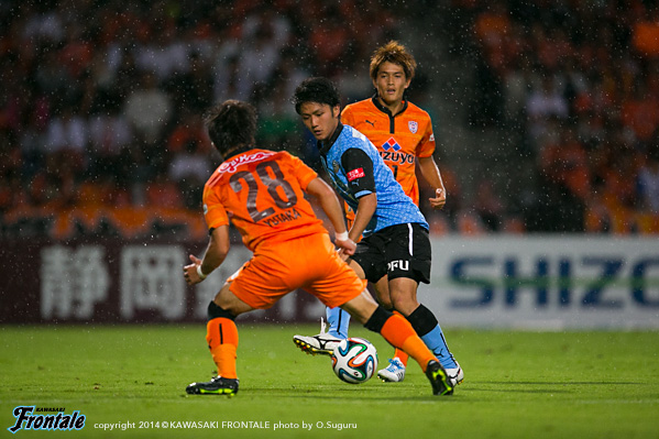 - 前半のうちに点を取れればよかったが、相手も頑張ってきていた。清水は一週間空いていたし、再開して最初の試合。仕切り直しということで気合いも入っていたと思う。前半から、相手のFWの足を守備で使わせることができていた。後ろがボールを持った時、自分とリョウタ(大島僚太)が常にボールに顔を出すことで相手の足を使わせることが出来た。あそこで後ろが蹴ったり、ボランチが隠れたら意味がない。ただ、前半は引き出してからの前線との絡みという部分で、少し距離が遠かった。背後を狙うことで相手ボールになってしまうロストの回数と、ボールを保持する時間帯のバランスも悪くて、エリア内に侵入していく回数も少なかった。後半、1点入った後に相手はガックリと落ちた感じがした。1点目の崩しは、最初は3対3で相手も対応していたが、続けているうちに崩れて来た。自分たちはボールを出して動いてを繰り返しながら、いつ、誰が、どこに侵入していくのかをうかがっていた。そこで小宮山が走ってくれた。前節のセレッソ戦のジュン(金久保順)のゴールとは崩しの形は違うが、チームとしてやっていることは同じ。あの試合では自分と小宮山でパスを回して、リョウタがボールを受けた瞬間にジュンが入っていった。今は誰がいつランニングするのかのイメージを共有できていると思う。今日は取るべき人が点を取ってくれた試合でもある。後ろがしっかりと攻撃を作ることで前の選手が決めてくれれば、中盤は飛び出さなくて良いから楽になる。そういう意味では狙い通り。チームとしても成熟してきたと思う。この状態で次に鳥栖とぶつかれるのは大きい。