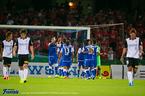 70分、浦和の攻撃。パスをつながれ左サイドから崩しを狙われるが、守備陣が落ち着いて対応。71分、中盤でボールを奪い返されるが守備陣が対応。72分、GKのロングキックからボールをつながれ左サイドからのクロスを李にヘッドですらされるが、GK杉山のビッグセーブでピンチをしのぐ。74分、右サイドに展開され関口にアーリークロスを入れられるがGK杉山がキャッチ。75分、ボールを回され右サイドの関口にクロスを入れられるが、谷口がクリア。77分、左サイドから崩しをかけられ槙野にクロスを入れられるが、GK杉山がキャッチ。浦和の攻勢をしのぎ迎えた78分、フロンターレの攻撃。直後に反撃をしかけレナトが自陣から左サイドをドリブル突破。中央でボールを受けた中村がラストパスを入れ、右サイドで受けた大久保が見事なミドルシュートを決めて追加点を挙げる。(2-1) 82分、實藤に代わり稲本がピッチへ。84分、フロンターレの攻撃。浦和の攻勢をしのいでカウンターへ。左サイドレナトが浮かし球を入れるが、飛び込んだ小林には合わず。85分、フロンターレの攻撃。中村のパスカットからカウンターへ。左サイドのレナトがドリブル突破からシュートを放つが、惜しくもゴール右に外れる。86分、さらに攻勢をかけ、レナトがクロスを入れるが森谷には合わず。89分、森谷に代えて田中裕がピッチへ。90分、浦和の攻撃。右サイドから崩しをかけられ柏木のシュートから混戦となり、右サイドからのクロスを那須にヘッドで合わせられるが枠を外れる。危ない場面だった。アディショナルタイム3分。90+1分、フロンターレの攻撃。カウンターから中央でボールを受けた中村が左足でシュートを放つが、惜しくもゴール上に外れる。90+2分、左サイドでボールを受けた登里がドリブルからシュートを放つが、GKのセーブに阻まれる。90+2分、小林に代えてジェシがピッチへ。稲本が1列上がる。90+3分、浦和の攻撃。ゴール前のロングボールからシュートに持ち込まれるが大きく外れる。90+4分、右コーナーキックの場面。柏木のボールに上がってきたGK西川が飛び込むが、守備陣が対応。試合は2-1でタイムアップ。