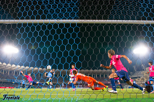 31分、遠目の位置からフォルランにミドルシュートを打たれるがGK杉山がキャッチ。33分、フロンターレの攻撃。自陣からボールをつなぎ、左サイドの登里がクロス。小林がヘッドで合わせるが、惜しくもGKにセーブされる。34分、レナトの右コーナーキックをニアサイドで實藤がすらすが、惜しくもGKにセーブされる。35分、C大阪の攻撃。自陣でパスカットされカウンターから右サイド南野にシュートを打たれるが、GK杉山がシュートストップ。ピンチをしのぐ。38分、フロンターレの攻撃、中盤からパスをつなぎ、右サイドの森谷がクロスを入れるがGKにキャッチされる。39分、C大阪の攻撃。丸橋の右コーナーキックは守備陣がクリア。39分、フロンターレの攻撃。直後にレナトが粘ってボールを運びカウンターを狙うが、ファールで止められる。40分、C大阪の攻撃。中盤でボールを奪われカウンターを受けるが、左サイドからのクロスは谷口がクリア。41分、フロンターレの攻撃。左サイドチェンジのボールをレナトがヘッドで落とし、森谷がヒールで合わせてかわしにかかるがDFにクリアされる。42分、レナトの右コーナーキックはクリアされる。43分、中村の左コーナーキックのクリアボールに反応した小宮山がダイレクトで狙うが、ミドルシュートは枠を外れる。45分、C大阪の攻撃。ボールを回され押し込まれるが、守備陣が落ち着いて対応。45分、フロンターレの攻撃。自陣からパスをつないで抜け出した左サイドレナトが折り返し。小林がシュートを放つが、惜しくもポストに当たって外れる。アディショナルタイム3分。迎えた45+1分、フロンターレの攻撃。相手陣内でボールを奪い、レナトとのパス交換から抜け出した中村が足を伸ばして触り、ボールはGKの股間を抜けてゴールネットに吸い込まれる。(4-1) 45+3分、フロンターレの攻撃。中村の浮かし球のクリアボールに反応した大久保が遠目からシュートを狙うが、大きく外れる。立ち上がりに失点を喫するものの、すぐさま反撃。小林のゴールで同点に追いつくと、その後は自分たちのリズムで試合を進めながら追加点を重ね、4-1で前半を折り返した。