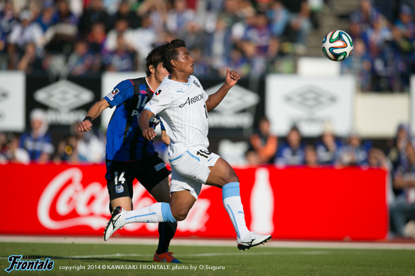 フロンターレのスターティングメンバーは、大久保と森島の2トップ、中盤左にレナト、右に小林、センターは中村と大島のコンビ、最終ラインは登里-谷口-實藤-田中裕、GK杉山。立ち上がり1分、フロンターレの攻撃。中村の浮かし球をゴール前で森島が落とし、レナトがトラップから右足でシュートを狙うが、ボールは惜しくもゴール上に外れる。3分、G大阪の攻撃。中盤やや右からのフリーキックの場面。遠藤のボールは大久保がクリア。4分、フロンターレの攻撃。中盤左からレナトが長いボールを入れるが、森島には通らず。5分、G大阪の攻撃。中盤でパスカットされゴール前にボールを入れられるが、守備陣がクリア。6分、フロンターレの攻撃。大久保とのワンツーから小林が右サイドから抜け出すが、シュートはブロックされる。7分、G大阪の攻撃。宇佐美にドリブルをしかけられ、左サイドからクロスを入れられるがGK杉山がキャッチ。8分、フロンターレの攻撃。直後に反撃を狙うが、中村はファールで止められる。9分、G大阪の攻撃。パトリックに右サイドから突破を許し折り返されるが、ゴール前で守備陣がクリア。10分、セカンドボールを拾われ押し込まれるが守備陣がしのぐ。13分、フロンターレの攻撃。中村を起点にパスをつなぎ、レナトが左サイドからクロス。森島がヘッドで合わせるが、ボールは威力なくGKにキャッチされる。14分、中村が中盤から裏のスペースを狙うが、右サイドから抜け出した小林はオフサイドの判定。15分、さらに中村が中盤から裏のスペースを狙うがレナトには合わず。17分、細かくパスをつなぎ、田中裕が右サイドからアーリークロス。森島がヘッドで合わせるが、ボールは枠に飛ばず。18分、G大阪の攻撃。宇佐美の右サイドからの折り返しは谷口がクリア。さらにスローインからゴール前にボールを入れられるが、内田のヘッドは大きく外れる。19分、パスをつながれ崩しを狙われるが、守備陣が落ち着いて対応。21分、フロンターレの攻撃。パスを細かくつなぎ、右サイド田中裕が切り返してゴール前にボールを入れるがクリアされる。22分、中村が狭いスペースを突いてスルーパスを入れるが、小林は惜しくもオフサイドの判定。