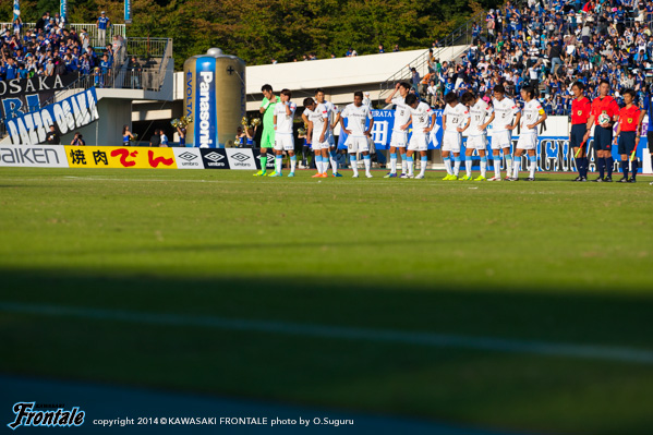 69分、G大阪の攻撃。攻勢をしのがれ反撃を浴び、宇佐美にカウンターを狙われるが實藤がぎりぎりのところで対応。危ない場面だった。70分、森島に代えて森谷がピッチへ。森谷が中盤右サイド、小林がFWのポジションへ。72分、フロンターレの攻撃。自陣からパスをつなぎ右サイドの森谷が浮かし球を入れ、裏のスペースに小林が抜け出すが惜しくもシュートブロックされる。73分、レナトの右コーナーキックはクリアされる。セカンドボールをつなぎ、中村とのワンツーからレナトが右サイドから折り返すがクリアされる。75分、中盤から中村が浮かし球を入れレナトが抜け出すが、GKに飛び出されゴールならず。75分、G大阪の攻撃。直後にカウンターを浴び、パトリックの折り返しを受けた宇佐美にシュートを狙われるが守備陣がブロック。ピンチをしのぐ。78分、カウンターから遠藤にボールを入れられるが、ゴール前で守備陣が対応。79分、フロンターレの攻撃。パスをつなぎ登里が左サイドから折り返すが、DFにブロックされる。80分、相手陣内でボールを奪い返し、左サイドのレナトがドリブル突破から折り返し。小林が合わせるが惜しくもGKのビッグセーブに阻まれる。81分、パスをつないで登里がクロス。ファーサイドで森谷が狙うが、惜しくもタイミングが合わず。83分、相手陣内で小林がパスカット。ゴールに迫るが惜しくもフィニッシュに持ち込めず。86分、自陣からボールをつなぎ、大久保のパスを受けた中村がスルーパスを入れるが惜しくも小林には合わず。86分、田中裕に代えて小宮山がピッチへ。87分、大久保が中央突破から縦パスを入れるがクリアされる。アディショナルタイム4分。90+1分、フロンターレの攻撃。ペナルティエリア前からのフリーキックの場面。中村のボールはクリアされる。90+3分、リスタートの流れから相手陣内に押し込むが、ラストパスにつながらず。90+3分、ゴール前にボールを入れ、中村のパスに反応した小宮山が右サイドから折り返し。走り込んだ谷口が合わせるが、惜しくも枠に飛ばず。90+4分、G大阪の攻撃。リンスに右サイドから折り返され大森に合わせられるが、GK杉山がキャッチ。試合は0-1でタイムアップ。