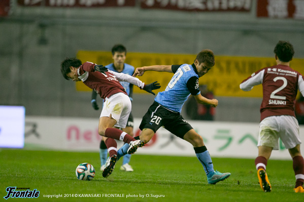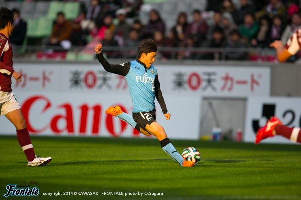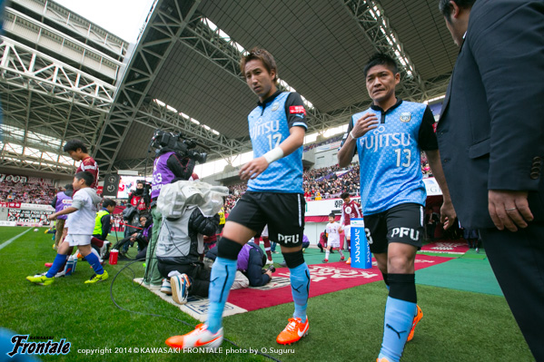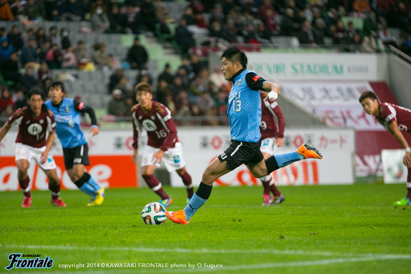 フロンターレのスターティングメンバーは、トップに大久保、左ワイドに登里、右にレナト、中盤は山本、大島、森谷が並び、底に福森、最終ラインは車屋-谷口-武岡、GK西部。立ち上がり1分、神戸の攻撃。自陣でボールを奪われピンチを招くが谷口がカット。1分、フロンターレの攻撃。直後に速攻からレナトがドリブルをしかけ、ペナルティエリア内で倒れるがノーファールの判定。3分、神戸の攻撃。サイドチェンジから速攻を狙われるが、レナトが戻り対応。5分、フロンターレの攻撃。右サイドからのフリーキックの場面。レナトが直接ゴールに向かうボールを入れるが、GKにセーブされる。さらに右ショートコーナーから山本がゴール前にボールを入れ、こぼれ球に反応した車屋がシュートを狙うがDFに当たって外れる。8分、神戸の攻撃。右サイドから速攻をかけられゴール前にボールが入るが守備陣が対応。9分、ペドロ ジュニオールのミドルシュートは大きく外れる。9分、フロンターレの攻撃。登里が左サイドをドリブル突破。そのままシュートを狙うがDFにブロックされる。迎えた11分、フロンターレの攻撃。レナトがゴール前にドリブルをしかけてシュート。GKがはじいたボールを大久保が押し込み先制点を挙げる。(1-0) 13分、神戸の攻撃。森岡の中盤からのダイレクトパスに反応したマルキーニョスに抜け出されるが、谷口と車屋で挟み込み対応。ピンチをしのぐ。15分、フロンターレの攻撃。福森のパスに反応した車屋が左サイドを抜け出し折り返すが、惜しくもクリアされる。16分、神戸の攻撃。自陣でボールを奪い返され、マルキーニョスにゴール前に入り込まれるが車屋が対応。その後は中盤での主導権争いが続く。20分、神戸の攻撃。相馬に左サイドからドリブルをしかけられ、ペナルティエリアに入り込まれるが最後は谷口が対応。22分、谷口が自陣から縦パスを狙うが登里に通らず。22分、神戸の攻撃。ロングボールを入れられるが、ペドロ ジュニオールには谷口が対応。23分、自陣でパスカットされるが、ゴール前で守備陣が対応。23分、さらに自陣でボールを奪われ小川にラストパスを入れられるが、ペドロ ジュニオールには車屋が対応。ピンチが続く。24分、チョン ウヨンの左コーナーキックは守備陣が対応。