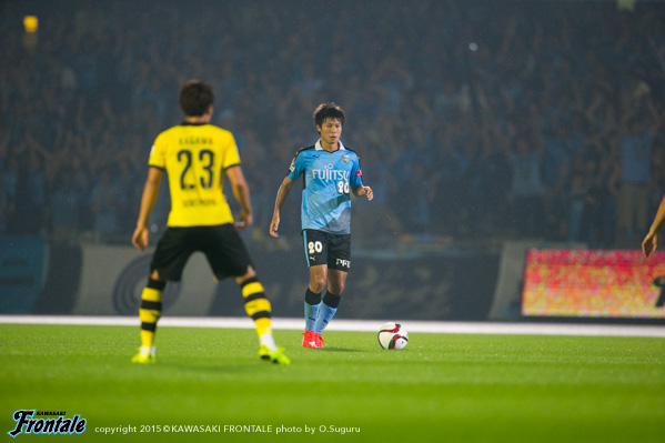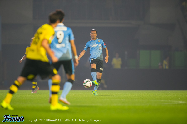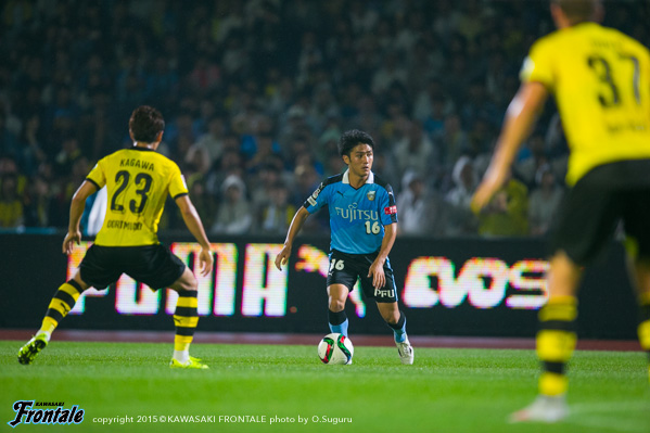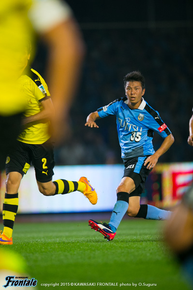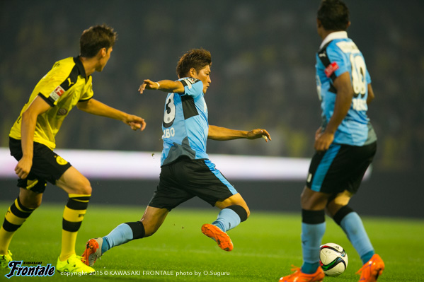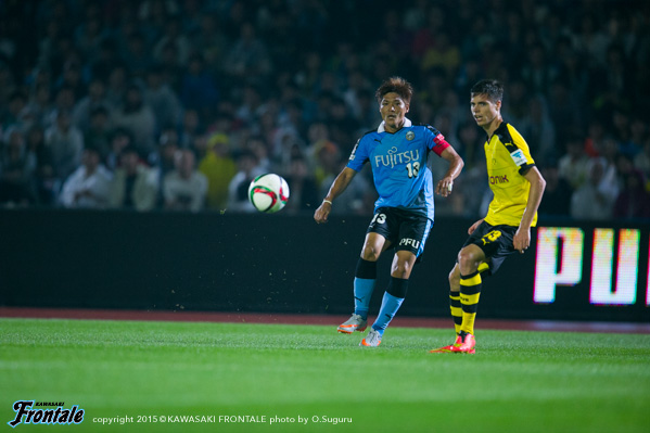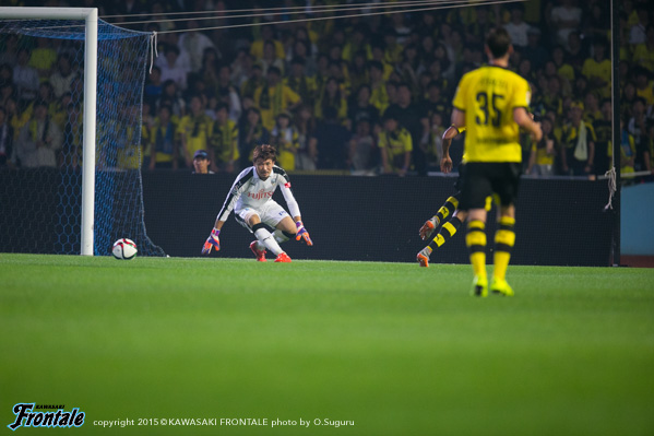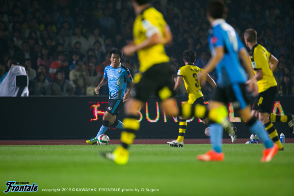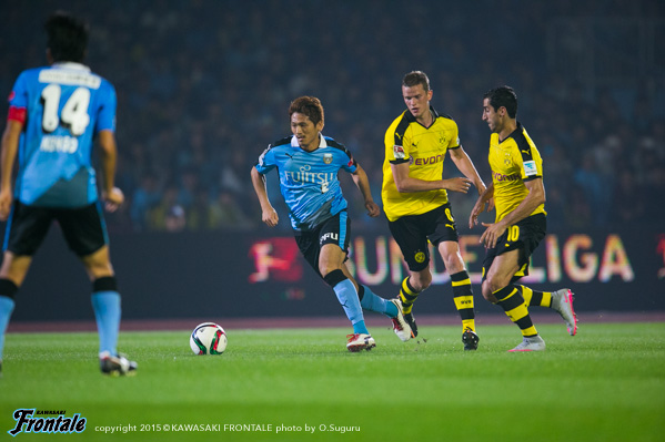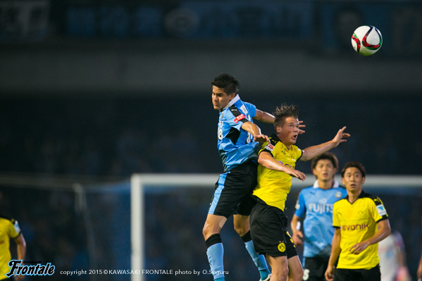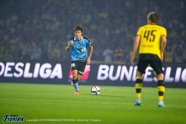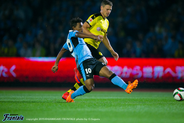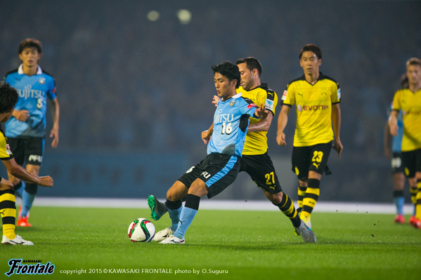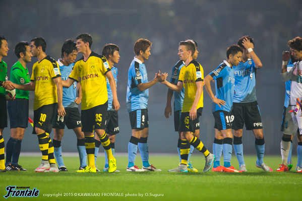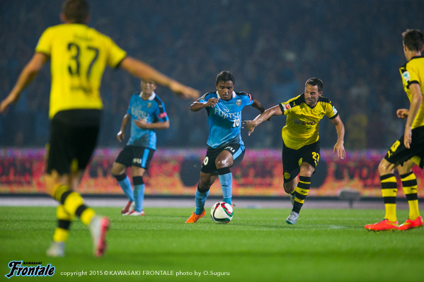 フロンターレのスターティングメンバーは、トップに大久保、ワイドは左にレナト、右に船山、中盤は前目に大島とエウシーニョ、底に谷口、最終ラインは小宮山-車屋-井川-武岡、GK新井。3分フロンターレの攻撃。車屋が自陣から長いボールを入れるがクリアされる。4分、最終ライン裏のスペースにレナトが抜け出すがオフサイドの判定。迎えた5分、ドルトムントの攻撃。右サイドから崩しをかけられ、ビシュチェクのクロスを香川にヘッドで合わせられ先制点を奪われる。(0-1) 7分、ドルトムントの攻撃。右サイドから崩しを狙われるが、守備陣が対応。8分、自陣でボールを奪われ、走り込んできた丸岡に合わせられるがGK新井が止める。9分、中盤でボールを奪われ反撃を浴びるが、ここは守備陣がしのぐ。11分、フロンターレの攻撃。中盤から大島が浮かし球を入れ船山が抜け出すが、惜しくもオフサイドの判定。12分、ドルトムントの攻撃。背後のスペースを突かれロイスに抜け出されるが、守備陣がしのぐ。13分、自陣でボールを奪われカウンターを受けるが、どうにかしのぐ。14分、フロンターレの攻撃。パスをつないで右サイドへ展開。エウシーニョがDFをかわしてシュートを放つが、ブロックされる。15分、エウシーニョの右サイドからの浮かし球を船山が胸トラップ。そのままシュートを放つが、惜しくもGKにキャッチされる。17分、ドルトムントの攻撃。中盤でルーズボールを拾われカウンターを受け、左サイドの丸岡に抜け出されるが武岡がスライディングで対応。ピンチをしのぐ。18分、パスをつながれ右サイドから崩しをかけられクロスを狙われるが、井川がブロック。20分、パスカットされカウンターを受け、ゴール前でロイスにラストパスを出されるが守備陣が対応。22分、左サイドで粘ってボールを奪い返したレナトが角度のないところからシュートを放つが、これは大きく外れる。