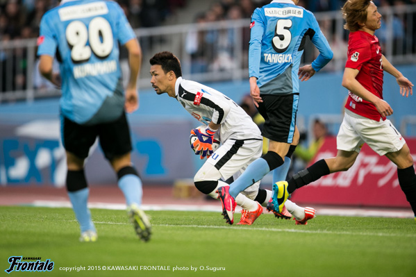 フロンターレのスターティングメンバーは、大久保とレナトの2トップ、中盤ワイド左に車屋、右にエウシーニョ、中盤センターは前目に森谷と大島、底に中村、最終ラインは谷口-角田-武岡の3バック、GK西部。通常とは逆のピッチからスタート。立ち上がり1分、浦和の攻撃。前線からプレッシャーをかけられるが角田がクリア。3分、フロンターレの攻撃。中盤でボールを奪い返すがパスがつながらず。4分、中村が中盤から右サイドに長いボールを入れるが、エウシーニョには合わず。6分、浦和の攻撃。パスをつながれサイドチェンジから左サイドの宇賀神に折り返されるが、GK西部がキャッチ。7分、中盤でボールを奪われ高木にドリブルからクロスを入れられるが、谷口がクリア。9分、柏木の縦パスを受けた関根に右サイドからクロスを入れられるが、ゴール前で守備陣が対応。11分、フロンターレの攻撃。中央でパスをつないで崩しを狙うがフィニッシュにつながらず。13分、中盤中央からのフリーキックの場面。中村が浮かし球を入れるがつながらず。14分、浦和の攻撃。中盤から柏木に長いボールを入れられ、ゴール前ズラタンがトラップしたボールを関根に詰められるがオフサイドの判定。危ない場面だった。17分、GKのフィードからボールをつながれ、左サイドから折り返されるが角田が対応。18分、中盤から柏木に浮かし球を入れられるが守備陣が落ち着いて対応。19分、フロンターレの攻撃。レナトを起点に左サイドへ展開。車屋がダイレクトで低いボールを入れるが惜しくもGKに止められる。さらに押し込み中村がミドルシュートを放つがゴール上に外れる。21分、左サイドでパスを細かくつなぎ、中央の中村の浮かし球に反応した森谷が反転しながらシュートを狙うが惜しくもゴール右に外れる。23分、右サイドの武岡がドリブルから速いボールをゴール前に入れるが、走り込んだ中村は止めきれず。24分、パスを細かくつなぎ左サイドから折り返し。エウシーニョが反転しながらシュートを放つが、惜しくもDFに当たって外れる。25分、浦和の攻撃。パスカットされカウンターを狙われるが、ズラタンには角田が対応。