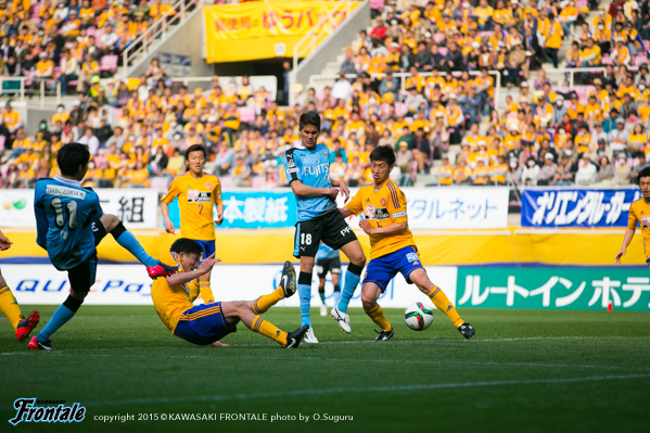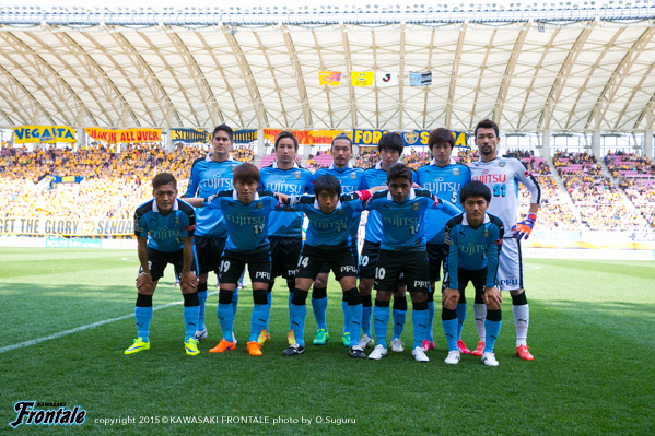 フロンターレのスターティングメンバーは、大久保とレナトの2トップ、左ワイドに車屋、右にエウシーニョ、中盤は前目に森谷と大島、底に中村、最終ラインは谷口-角田-武岡の3枚、GK西部。立ち上がり1分、フロンターレの攻撃。細かくパスをつないでエウシーニョが縦パスを入れるが、大久保には合わず。2分、仙台の攻撃。速攻から縦パスを受けたウイルソンに反転されるが、角田がシュートブロック。4分、フロンターレの攻撃。中村が中盤から浮かし球を入れるが、エウシーニョはオフサイドの判定。5分、仙台の攻撃。中盤でボールを奪われカウンターを狙われるが、ウイルソンには角田がスライディングで対応。6分、左サイドから崩しをかけられ、入れ替わられた野沢にシュートを打たれるがGK西部の正面。7分、フロンターレの攻撃。レナトを起点にパスをつなぎ、エウシーニョの戻しを受けたレナトがミドルシュートを狙うがうまくミートせず。9分、中村がロングボールを入れ、DFのバックパスに大久保が詰めるがGKにキャッチされる。11分、仙台の攻撃。中盤でボールを奪われカウンターを受け右サイド奥埜の戻しが梁に渡るが、中村と大島で戻り対応。12分、フロンターレの攻撃。細かくパスをつなぎ、レナトからボールを受けたエウシーニョが右サイドから切り返して左足で狙うが、ミドルシュートはゴール左に外れる。13分、仙台の攻撃。中盤からロングボールを入れられるが、奥埜には武岡が対応。14分、フロンターレの攻撃。レナトが左サイド裏に抜け出し折り返し。ルーズボールを再びレナトが受けるが、左サイド至近距離からのシュートはDFにブロックされる。16分、仙台の攻撃。左サイド裏のスペースにボールを出され石川にクロスを入れられるが、ゴール前を通過。17分、野沢の右コーナーキックは武岡が対応。19分、フロンターレの攻撃。大島からパスを受けたエウシーニョがミドルシュートを放つが、ゴール左に外れる。21分、パスを細かくつないで押し込むがラストパスにつながらず。22分、パスをつないで大久保がゴール前にボールを入れるが、GKにキャッチされる。24分、仙台の攻撃。自陣でルーズボールを拾われ左サイドのウイルソンにシュートを打たれるが角田がブロック。24分、野沢のコーナーキックは守備陣がクリア。26分、フロンターレの攻撃。右サイドから崩しをかけて中村のボールに反応した武岡が抜け出し、深い位置から速い折り返し。このボールがDFに当たりゴールに向かうが、クロスバーにはね返り外れる。惜しい場面だった。