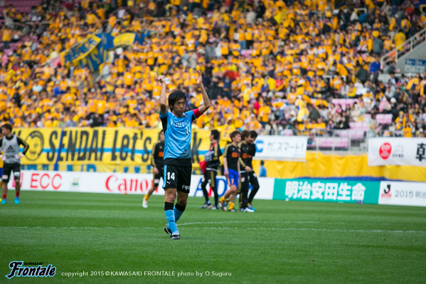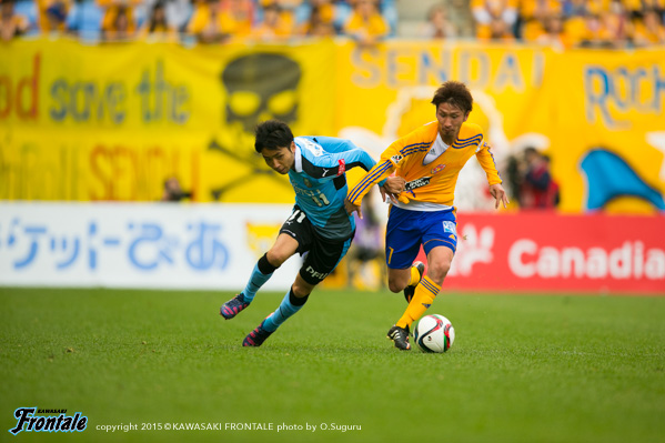 71分、仙台の攻撃。左サイドに長いボールを入れられ、野沢にスルーパスを狙われるが角田がカット。危ない場面だった。直後の72分、反撃を繰り出し、大久保のスルーパスに合わせたレナトがGKの脇を抜くシュートを決めて勝ち越しゴールを奪う。(2-1) 74分、フロンターレの攻撃。細かくパスをつなぎ船山の浮かし球に大久保が飛び込むが触れず、GKにキャッチされる。76分、パスをつないで左サイドの車屋が折り返し。こぼれ球をレナトがダイレクトで狙うが、大きく外れる。77分、仙台の攻撃。フリーキックからゴール前で混戦となり、こぼれ球をシュートに持ち込まれるがゴール左に外れる。危ない場面だった。79分、アーリークロスからゴール前で混戦となり、右サイドのウイルソンのクロスを金園にヘッドで合わせられるが、GK西部がぎりぎりのところでセーブ。迎えた80分、仙台の攻撃。さらにゴール前に圧力をかけられ、左サイドからのクロスを右サイドから上がってきた多々良に決められ同点に追いつかれる。(2-2) 81分、フロンターレの攻撃。直後に反撃。前線に抜け出した大久保がシュートを放つが、惜しくもDFに当たって外れる。83分、速攻から大島が左サイドへ展開。レナトがDFをかわしながら折り返すが、ゴール前には合わず。84分、仙台の攻撃。中盤でボールを奪われカウンターを受けるが、ウイルソンには角田が対応。ウイルソンのオフサイドの判定。迎えた86分、フロンターレの攻撃。大島を起点にパスをつなぎ、左サイドを抜け出したレナトが速い折り返し。ゴール前にフリーで飛び込んだ大久保が合わせ、再び勝ち越しに成功する。(3-2) 87分、レナトに代えて井川が入り、井川が相手FWにマンツーマンでマークにつく形に。88分、仙台の攻撃。フリーキックからゴール前で混戦となるが守備陣がかき出す。89分、中盤中央からのフリーキックの場面。梁のボールからゴール前で混戦となるが角田がクリア。89分、パワープレーをかけられゴール前にボールを入れられるが、守備陣がクリア。我慢の時間が続く。アディショナルタイム5分。90+2分、仙台の攻撃。金園に左サイド突破を狙われるが井川が対応。90+3分、仙台の攻撃。左コーナーキックの場面。梁のボールを渡部にヘッドで合わせられるが、枠を外れる。90+4分、仙台のパワープレーをしのぐ時間帯が続く。90+5分、フロンターレの攻撃。カウンターから船山が左サイドをドリブル突破。ゴール前に迫り折り返しを入れるが、惜しくもブロックされて小林に通らず。試合は3-2でタイムアップ。