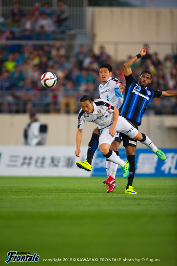 23分、右サイドから崩しをかけられ押し込まれるが、米倉のクロスは守備陣がブロック。24分、ワンツーから抜け出した宇佐美にシュートを打たれ、ブロックしたボールを再び宇佐美に狙われるが、ループシュートはゴール右に外れる。26分、ペナルティエリア左前からのフリーキックの場面。遠藤のシュートはクロスバーに当たって外れる。危ない場面だった。27分、自陣でボールを奪われ右サイドの米倉にクロスを入れられるが井川がクリア。28分、フロンターレの攻撃。G大阪の攻勢をしのいでレナトがドリブル突破。カウンターを狙うがDFに挟み込まれ止められる。29分、G大阪の攻撃。ロングボールをパトリックに落とされ、阿部にシュートを打たれるがゴール左に外れる。31分、フロンターレの攻撃、中盤やや左からのフリーキックの場面。中村がボールを入れ、セカンドボールを拾って押し込むがシュートに持ち込めず。33分、ボールを奪い返して押し込むが、ラストパスにつながらず。34分、G大阪の攻撃。パトリックに右サイドから突破を狙われ折り返し。こぼれ球を阿部に狙われるが、ミドルシュートはGK新井の正面。35分、フロンターレの攻撃。中盤から森谷が裏のスペースにボールを入れるが、飛び込んだ大久保は惜しくもオフサイドの判定。37分、G大阪の攻撃。GK新井のキックを自陣でカットされ、速攻から左サイド大森に折り返されるがボールはゴール前を通過。ことなきを得る。38分、自陣でパスカットされ速攻を受け、左サイドからの折り返しのこぼれを米倉に狙われるが車屋がシュートブロック。危ない場面だった。40分、さらに速攻から宇佐美に強烈なミドルシュートを打たれるが、GK新井の好セーブでしのぐ。41分、遠藤の右コーナーキックから宇佐美にゴール前へ浮かし球を入れられるが、谷口がクリア。迎えた42分、G大阪の攻撃。中盤左サイドからアーリークロスを入れられ、こぼれ球を阿部がシュート。ブロックしたこぼれ球を宇佐美に拾われ、左サイドからシュートを決められ先制点を奪われる。(0-1) 45分、フロンターレの攻撃。細かくパスをつないで縦パスを受けたレナトがペナルティエリア内に入るが、DFに止められる。アディショナルタイム1分。45+1分、G大阪の攻撃。自陣でボールを奪われシュートに持ち込まれるが、DFに当たって外れる。45+2分、右コーナーキックの流れから自陣でボールを奪い返され、宇佐美に右サイドからシュートを打たれるがGK新井がキャッチ。立ち上がりから鋭い出足でプレッシャーをかけてくるG大阪に押し込まれる苦しい展開。選手の並びや布陣を変えながらどうにかしのいでいたものの、アーリークロスからのこぼれ球を宇佐美に決められ失点。0-1で前半を折り返した。