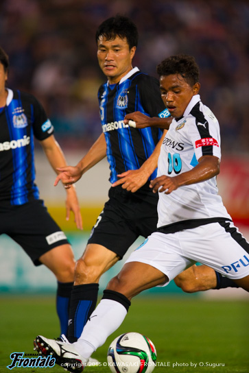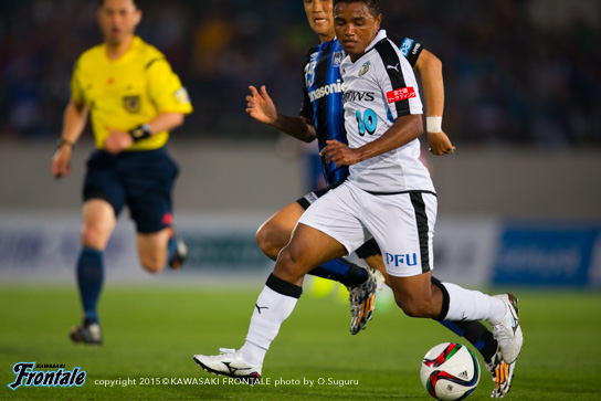 フロンターレのスターティングメンバーは、トップに大久保、その下に中村、左ワイドにレナト、右に船山、中盤センターは森谷と谷口、最終ラインは車屋-角田-井川-エウシーニョ、GK新井。立ち上がり1分、G大阪の攻撃。中盤でボールを奪われ速攻を浴びボールを入れられるが、GK新井がキャッチ。2分、自陣でボールを奪い返され宇佐美に左サイドからボールを入れられるが、ゴール前を通過。4分、最終ラインからサイドチェンジの長いボールを入れられるが、レナトが戻り対応。5分、左サイドから崩しをかけられ、藤春にクロスを狙われるが井川がブロック。5分、左ショートコーナーから遠藤にボールを入れられるが守備陣がクリア。6分、右サイドから崩しをかけられ、遠藤にゴール前にボールを入れられるがGK新井がキャッチ。7分、フロンターレの攻撃。レナトの左コーナーキックはGKにパンチングされる。9分、ボールをつないで中村がスルーパスを狙うが、DFにブロックされる。10分、G大阪の攻撃。自陣でカットされ宇佐美にドリブルからシュートを打たれるがGK新井の正面。危ない場面だった。11分、攻勢をしのがれ自陣から一発のスルーパスを狙われるが、GK新井が飛び出しクリア。さらに攻勢をかけられ宇佐美に中央からミドルシュートを打たれるが、これはゴール右に外れる。12分、中盤でボールを奪われ攻勢をかけられるが、守備陣がクリア。13分、フロンターレの攻撃。パスをつないで右サイドのエウシーニョが速いボールを入れ、ゴール前でボールを受けたレナトが反転しながらシュートを放つがDFにブロックされる。14分、G大阪の攻撃。直後に攻勢をかけられ、ゴール前パトリックにシュートを打たれるがGK新井の正面。危ない場面だった。15分、フロンターレの攻撃。大久保が右サイドへ展開。走り込んだエウシーニョが折り返すがクリアされる。さらに攻勢をかけ、右サイドのエウシーニョが左足でシュートを狙うがブロックされる。16分、中盤でパスをつなぎ森谷が右サイドからミドルシュートを放つが、ブロックされる。17分、パスをつないで右サイドのエウシーニョがゴール前へ速いボール。こぼれたボールを大久保が狙うが、左サイド角度のないところからのシュートはGKに止められる。19分、前線でレナトが粘り、谷口の縦パスを受けたレナトがミドルシュートを放つが、DFに当たりGKにキャッチされる。20分、G大阪の攻撃。左サイドから崩しをかけられ、フリーで抜け出した藤春に折り返されるがゴール前で車屋がクリア。危ない場面だった。20分、左コーナーキックからセカンドボールをつながれ押し込まれるが、ゴール前へのボールはGK新井がパンチング。21分、遠藤の右コーナーキックからゴール前にボールがこぼれるが、GK新井がキャッチ。危ない場面が続く。