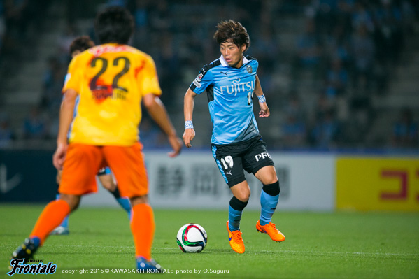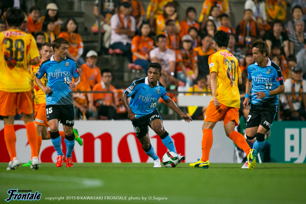 フロンターレのスターティングメンバーは、トップに杉本、左ワイドにレナト、右に船山、中盤は左に車屋、右にエウシーニョ、センターは中村と森谷のコンビ、最終ラインは谷口-角田-武岡、GK新井。立ち上がり3分、清水の攻撃。右スローインからペナルティエリア内にボールが入るが、谷口が対応。清水のファール。4分、フロンターレの攻撃。中盤から長いボールが入り、杉本が収めるがファールをとられる。5分、清水の攻撃。左サイドチェンジをミッチェル デュークにヘッドで折り返され、大前にミドルシュートを打たれるがゴール左に外れる。6分、セカンドボールを拾われ押し込まれるが、守備陣がカット。7分、フロンターレの攻撃。直後にカウンターを狙うが前線に合わず。迎えた7分、清水の攻撃。右サイドから崩しをかけられ裏のスペースに抜け出した枝村に折り返され、フリーのピーター ウタカにヒールで流し込まれて先制点を奪われる。(0-1) 8分、清水の攻撃。自陣でボールを奪われ石毛のラストパスを受けたミッチェル デュークに左サイドからシュートを打たれるが、ゴール右に外れる。11分、フロンターレの攻撃。中村が中盤からサイドチェンジ。左サイド深い位置で追いついたレナトが角度のないところからシュートを放つが、惜しくもゴール前を通過。12分、清水の攻撃。ゴール前のルーズボールを水谷に右サイドから折り返され、ミッチェル デュークが入り込んでくるが武岡が対応。13分、フロンターレの攻撃。中盤左サイドから森谷がスルーパスを入れるが、船山には合わず。14分、清水の攻撃。右サイドの水谷にサイドチェンジのボールを入れられミッチェル デュークに渡るが、守備陣が対応。15分、フロンターレの攻撃。中村が右サイドへ展開するが、レナトには通らず。17分、清水の攻撃。中盤でパスカットされカウンターから押し込まれるが、守備陣が落ち着いて対応。19分、セカンドボールを拾われ押し込まれるが、守備陣が対応。20分、フロンターレの攻撃。ワンツーから抜け出したエウシーニョが右サイドから抜け出しシュートに持ち込むが、GKに止められる。21分、清水の攻撃。ロングボールのこぼれ球を拾われ石毛にシュートを打たれるが、大きく外れる。22分、中盤でカットされカウンターを受け、左サイドのピーター ウタカに折り返されるが守備陣が対応。23分、フロンターレの攻撃。清水の攻勢をしのいでカウンターへ。右サイドでフリーでボールを受けた船山がドリブル突破からシュート。GKがはじいたボールにレナト、杉本と詰めるが、惜しくもシュートに持ち込めず。