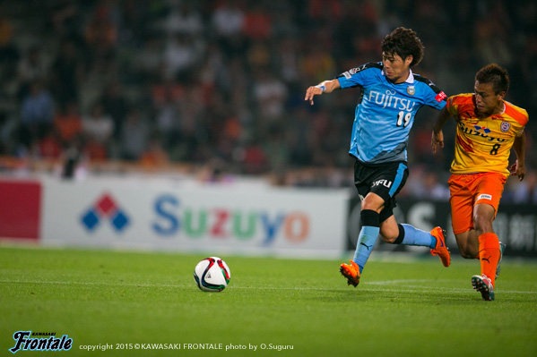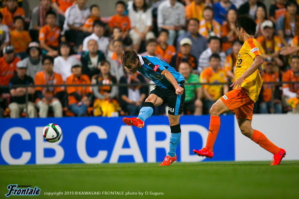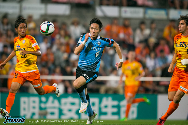 迎えた25分、清水の攻撃。右サイドからのフリーキックの場面。石毛のボールをニアサイドの枝村にヘッドで合わせられ、追加点を奪われる。(0-2) 27分、フロンターレの攻撃。中村が中盤から長いボールを入れるが、飛び出したGKにクリアされる。28分、清水の攻撃。前線でボールを収めたピーター ウタカにスルーパスを入れられるが、GK新井がキャッチ。迎えた30分、森谷が左サイドに出したボールに車屋が追いつき、深い位置から折り返し。レナトが右足で合わせて1点を返す。(1-2) 31分、フロンターレの攻撃。中村のサイドチェンジのボールを受けたエウシーニョが右サイドから切り返しシュートを放つが、うまくミートせず。32分、車屋が左サイドをドリブル突破。DFをかわして深い位置からシュートを放つが、惜しくもゴール左に外れる。34分、レナトのスルーパスに追いついたエウシーニョが右サイドから折り返すが、DFにブロックされる。35分、清水の攻撃。ピーター ウタカに中央からドリブル突破を許しシュートに持ち込まれるが、ゴール右に外れる。危ない場面だった。37分、フロンターレの攻撃。早いリスタートから中村が中盤から浮かし球を入れるが、抜け出した船山はオフサイドの判定。40分、中盤センターからのフリーキックの場面。中村のボールから混戦となるが、DFにクリアされる。41分、清水の攻撃。前線左で大前に収められゴール前にボールを入れられるが、そのままゴール前を通過。43分、右コーナーキックの場面。石毛のボールは杉本がクリア。流れたボールを竹内に狙われるが、シュートは大きく外れる。45分、中盤でパスカットされ決定的なカウンターから大前にシュートに持ち込まれるが、飛び出したGK新井のセーブで難を逃れる。アディショナルタイム2分。45+2分、フロンターレの攻撃。スローインの流れから左サイドから崩しをかけるが、フィニッシュにつながらず。立ち上がりの時間帯でのマークのずれを突かれて失点。さらにセットプレーから追加点を許し厳しい流れとなるが、車屋のドリブル突破からレナトのゴールで1点を返し前半を折り返した。