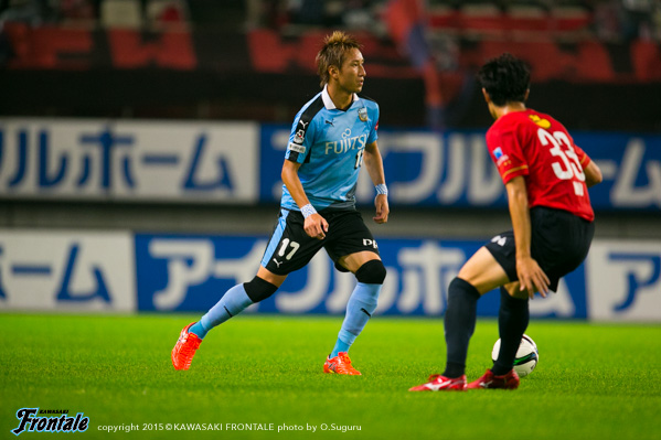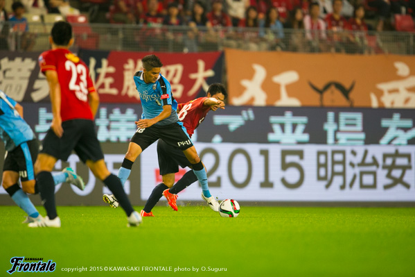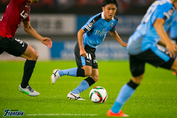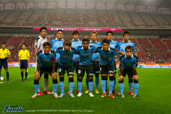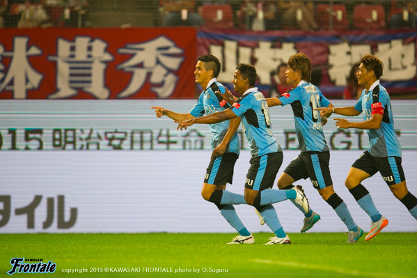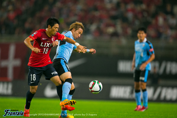 フロンターレのスターティングメンバーは、トップに大久保、左にレナト、右に船山、中盤は左に小宮山、右にエウシーニョ、中央は森谷と谷口のコンビ、最終ラインは車屋-井川-武岡の3バック、GK新井。立ち上がり2分、フロンターレの攻撃。左サイドからレナトが折り返し。中央で船山がはたき森谷がダイレクトで合わせるが、シュートはGKにキャッチされる。3分、鹿島の攻撃。左サイドから金崎に突破を狙われるが、武岡が対応。5分、フロンターレの攻撃。エウシーニョの右サイドからのクロスからセカンドボールを拾いゴール前に押し込むものの、ラストパスが合わず。6分、左サイドから崩しをかけて小宮山が折り返しを入れるがクリアされる。迎えた8分、フロンターレの攻撃。レナトの中盤からドリブル突破。左サイドの小宮山が中央に切れ込みながらゴール前にボールを入れ、ペナルティエリア内で粘ったエウシーニョがDFにかこまれながらも、粘り強くシュートまで持ち込みゴールに吸い込まれる。(1-0) 9分、鹿島の攻撃。右サイドから崩しをかけられクロスが入るが、守備陣がクリア。10分、ロングボールからパスをつながれ金崎にミドルシュートを打たれるが、ボールはクロスバーに当たって外れる。12分、フロンターレの攻撃。鹿島の攻勢をしのいでカウンターを狙うが、船山はファールで止められる。13分、リスタートの流れから船山とのワンツーから抜け出した大久保がミドルシュートを放つが、ゴール上に外れる。14分、細かくパスをつないで崩しを狙うがクリアされる。15分、右サイドから崩しをかけ、レナトが切れ込みながらシュート。GKがはじいたボールを拾い右サイド森谷がクロス。船山が合わせるが、惜しくもゴール上に外れる。17分、中盤から裏のスペースを狙うが、飛び出した船山はオフサイドの判定。21分、鹿島の攻撃。中盤でボールを奪われ反撃を受け、ペナルティエリア内に入り込まれるが井川が対応。22分、右コーナーキックの場面。小笠原のボールは大久保が対応。23分、フロンターレの攻撃。自陣からパスをつなぎ、右サイドのエウシーニョからボールを受けた船山がミドルシュートを放つが枠を外れる。25分、鹿島の攻撃。左サイドから崩しを狙われるが、武岡が対応。
