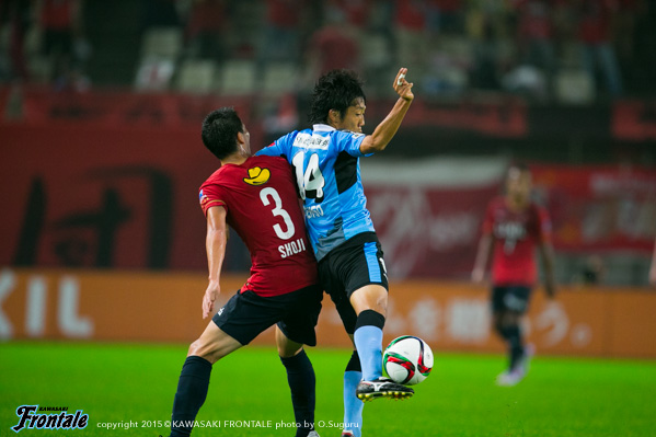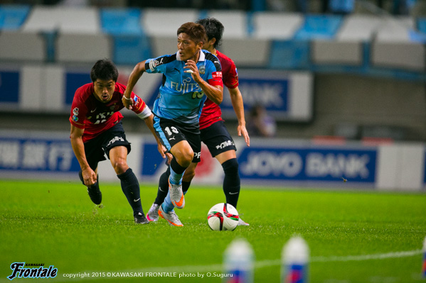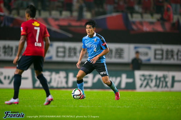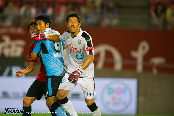 26分、左サイドから崩しを狙われるが、裏のスペースに出たボールは武岡が対応。27分、鹿島の攻撃。中盤でカットされカウンターを狙われるが、大久保と船山で戻り対応。30分、フロンターレの攻撃。中盤でパスをつなぎ谷口が裏のスペースを狙うが、走り込んだ森谷にはタイミングが合わず。31分、レナトが中盤から浮かし球を入れるがクリアされる。32分、鹿島の攻撃。直後にカウンターを狙われるが、赤崎へのボールは武岡が対応。迎えた34分、フロンターレの攻撃。右サイドから崩しをかけ、谷口とのパス交換から切れ込んだレナトが見事なミドルシュートを決めて追加点を奪う。(2-0) 37分、鹿島の攻撃。縦パスを受けた土居に左サイドから切れ込みシュートを打たれるが、ゴール左に外れる。危ない場面だった。38分、速攻を受けて左サイドから崩しをかけられ、最後は昌子にシュートを打たれるが守備陣がブロック。39分、小笠原の左コーナーキックは守備陣が対応。40分、小笠原の右コーナーキックはGK新井のパンチングでしのぐ。42分、パスをつながれ左サイドからクロスが入りこぼれ球を赤崎に狙われるが、シュートは枠を外れる。43分、フロンターレの攻撃。小宮山がサイドチェンジ。右サイドの船山が折り返しを入れるがクリアされる。44分、さらに押し込みエウシーニョが持ち込むが、浮かし球はクリアされる。44分、鹿島の攻撃。直後にカウンターを受けるが、守備陣が対応。迎えた44分、鹿島の攻撃。さらに攻勢をかけられ、金崎に左足でカーブをかけたミドルシュートを決められ1点を返される。(2-1) アディショナルタイム2分。45+1分、鹿島の攻撃。左サイドからカイオにミドルシュートを打たれ、DFに当たりコースが変わるがGK新井がキャッチ。45+2分、セカンドボールを拾われて押し込まれ、最後は青木にミドルシュートを打たれるがGK新井がキャッチ。45+3分、ワンツーから抜け出した土居に左サイドからシュートを打たれるが、GK新井のセーブでしのぐ。立ち上がりに時間帯にエウシーニョのゴールで先制。ボールを回しながら試合を進め、レナトのミドルシュートでさらに追加点を奪うが、終盤鹿島の反撃を受けミドルシュートから失点。2-1で前半を折り返した。