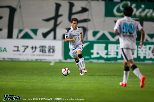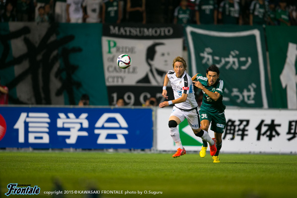 26分、松本の攻撃。左サイドからのフリーキックの場面。岩上のボールを折り返されるが、中村がクリア。27分、左サイドからのフリーキックの場面。岩上のボールは守備陣がクリア。29分、フロンターレの攻撃。自陣からパスをつなぎ、大久保がドリブル突破。左サイドの田坂がゴール前にボールを入れるが、惜しくもクリアされる。31分、右サイドから崩しをかけ、エウシーニョからラストパスを受けた船山がターンしてシュートを放つが、惜しくもゴール上に外れる。32分、松本の攻撃。攻勢をしのがれカウンターを狙われるが、谷口が戻りながら対応。33分、岩上のロングスローから混戦となるが守備陣がかき出す。さらにスローインの流れからゴール前にロングボールを入れられるが、GK新井がキャッチ。34分、中盤でボールをカットされるが、武岡が戻り対応。迎えた35分、フロンターレの攻撃。中盤からパスをつないで船山がドリブルで勝負をしかけ、こぼれ球に反応した大久保が強烈なミドルシュートを決めて3点目を奪う。(3-0) 37分、足を痛めていた武岡に代わり車屋が入り、左ストッパーへ。谷口が右ストッパーに回る。38分、フロンターレの攻撃。ボールを回して田坂から遠目からシュートを放つが、DFにブロックされる。39分、松本の攻撃。攻勢をしのがれカウンターを狙われるが、オビナには井川が対応。40分、松本の攻撃。岩上のロングスローは谷口がクリア。41分、フロンターレの攻撃。パスを細かくつないで崩しをかけ、左サイドの車屋が低いボールを入れるが、飛び込んだ大久保には惜しくも合わず。43分、パスをつないで右サイドへ展開。エウシーニョの折り返しはゴール前を通過。左サイドの車屋がシュートを放つが、DFにブロックされる。44分、船山が遠目からシュートを放つがゴール左に外れる。45分、松本の攻撃。速攻から右サイドの田中にアーリークロスを入れられ、オビナにヘッドで合わせられるがGK新井がキャッチ。ピンチをしのぐ。アディショナルタイム2分。45+1分、フロンターレの攻撃。左サイドから崩しをかけ、船山が深い位置から折り返すがゴール前に合わず。立ち上がりからフロンターレがパスをつないで松本陣内に押し込む展開。田坂が復帰後初ゴールを挙げると、セットプレーから谷口がゴールを決めて追加点。さらに大久保が見事なミドルシュートを決め、終始主導権を握り3-0で前半を折り返した。